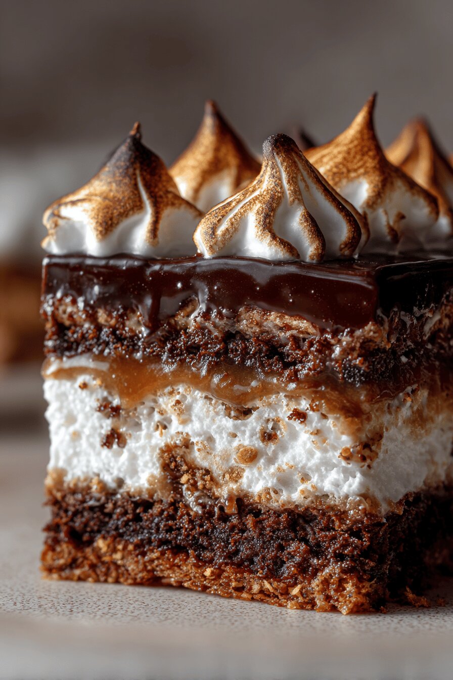 Start with buttercream caramel as it needs longest time to cool. Prepare ganache next; leave covered at room temperature so it thickens without refrigeration and loses sheen otherwise. Almond meringue piped carefully, low temperature baking prevents cracking and achieves crisp shell with soft interior. Cake mixed gently, dry ingredients combined with wet slowly to avoid over developing gluten. Boiling water added stepwise to improve batter smoothness, cocoa bloom control. Bake times monitored closely, toothpick inserted to confirm doneness, reduce by 2-3 minutes if oven runs hot. Cooling times key; ganache from fridge too firm, cream too runny if warm. Assembly done layering from bottom: cake, ganache spread thickly but not sliding, meringue rectangle positioned gently so it doesn’t shatter. Garnish piped alternating buttercream and ganache for contrast. Small meringue drops add accents and crunch. Entire process flexible to room temperature and humidity, humidity softens meringue. Ready several hours after assembly; flavors meld with rest but still hold texture.