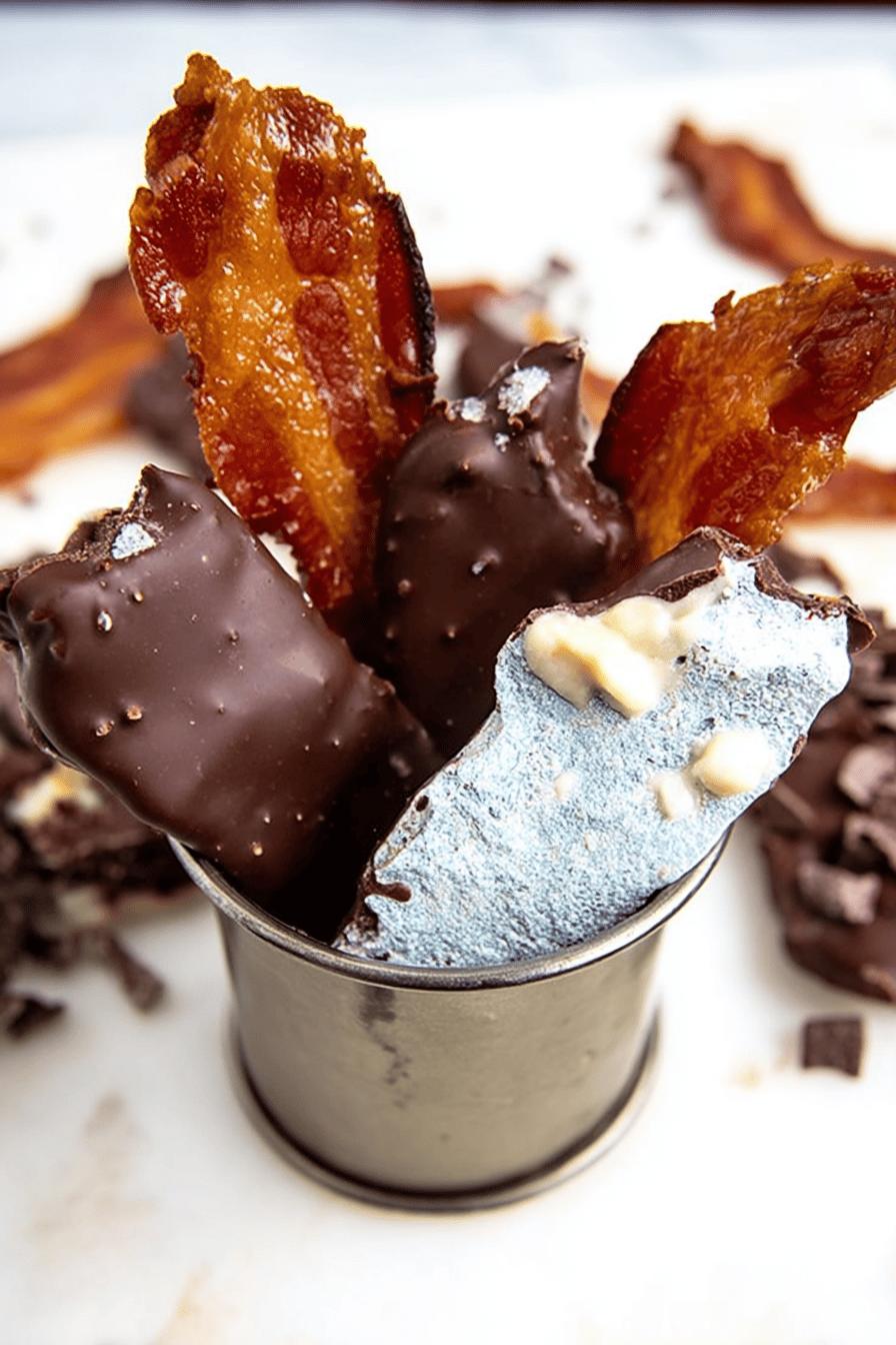- Serve cold or just off the fridge for contrast of fat richness and crisp chocolate snap. Store in airtight container lined with parchment, refrigerated up to 4 days. Warm bacon loses snap; re-chill before serving. No freezer—chocolate texture may worsen. For softer bite, dip in milk chocolate or white chocolate instead, accounting for shorter fridge set time.