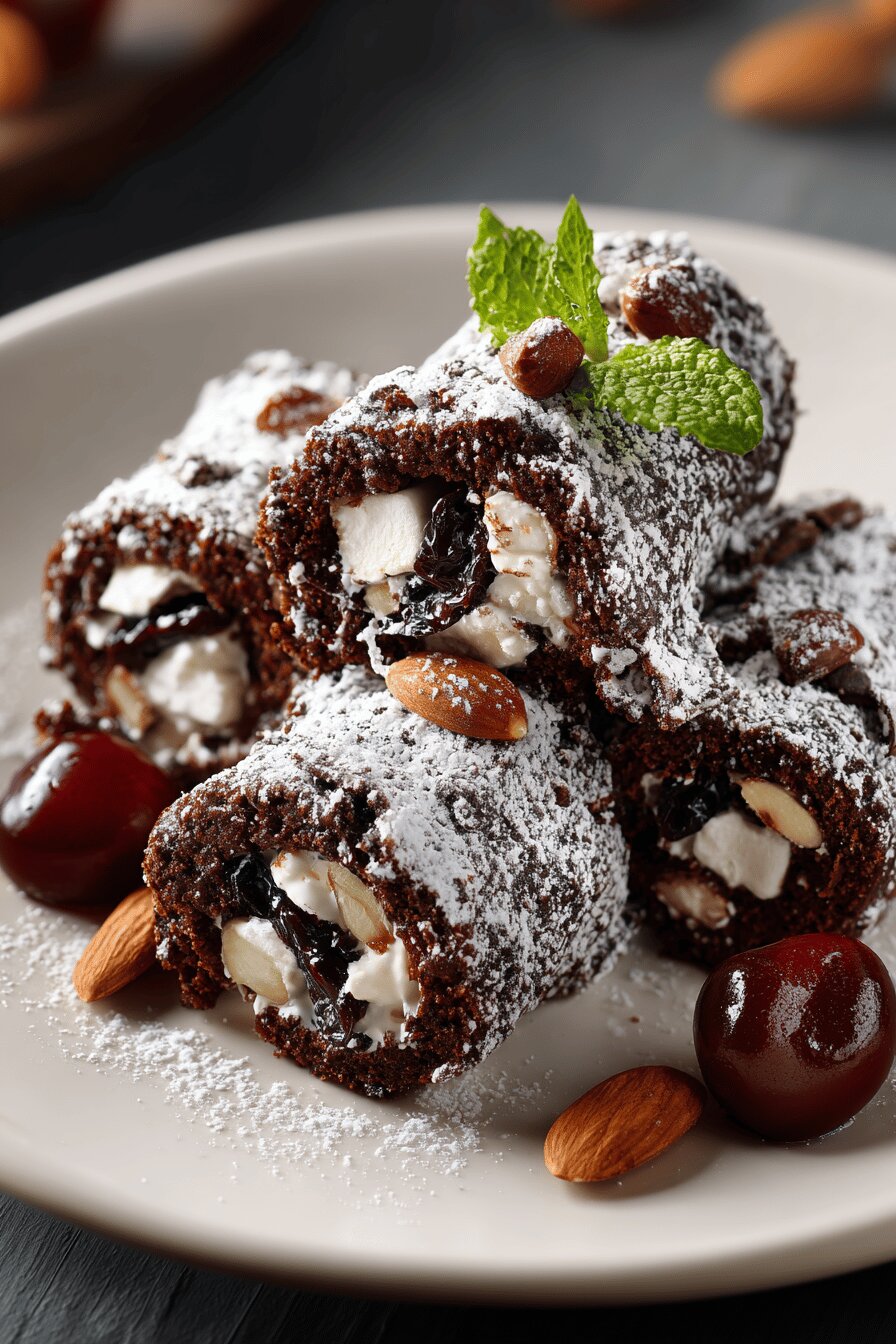 Dark chocolate melting slow over simmering water. Butter softens, blending smoothly. Crisp biscuit chunks ready to deliver crunch. Marshmallows cut in small cubes promising little pops of soft sweetness. Dried cherries swapped in place of traditional golden raisins—sharper, a little tart. Toasted almonds replacing pine nuts—different crunch, more nuttiness. Everything folded gently to keep texture distinct. Rolled tight in foil sheets, twisted ends pinched close. Chilled not rushed until firm enough to slice clean. Rolled in powdered sugar—dusty white exterior mimics real cured meats like driedsaucisson. Rustic presentation on wooden board. Not just sweets but texture, aroma, depth. Egg or flax egg to bind. Cinnamon or pinch of sea salt optional for complexity. A classic turned modern; straightforward no bake, relying on touch and feel over rigid timings. Patience pays off. Resist temptation to slice too early—chunks must be set. The aromas of dark chocolate and toasted almonds fill kitchen at chilling time, tempting but worth wait. Bite into rough crunch, marshmallow softness, fruit brightness. Simple transformed.