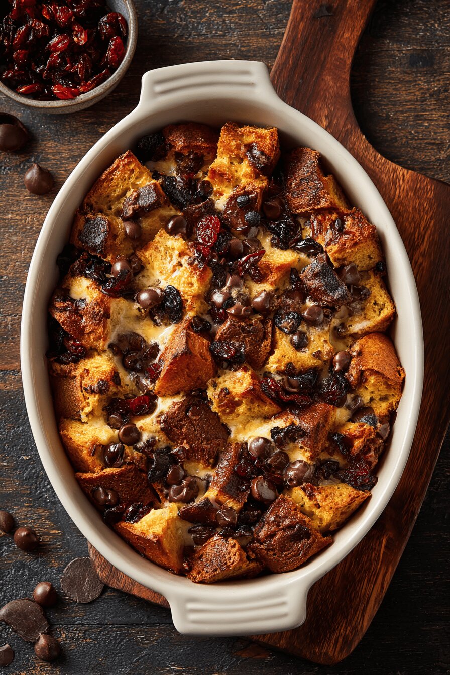 Bread choice impacts everything. Brioche or challah with good crumb works because it absorbs and holds liquid without dissolving. Stale bread is great but avoid mold or extreme dryness. Eggs: yolks are rich, silkier texture, but could swap one yolk for a whole egg if pressed. Extract: almond extract swaps vanilla here, sharp contrast brightens chocolate. Milk: chocolate milk is base but homemade with cocoa and sugar dissolved in warm milk works. Chocolate chips hold shape better than coarse chunks which can make patchy melts. Dried cranberries bring vibrant tartness instead of the original cherries — better shelf life, more kitchen-friendly. Cinnamon adds warmth without overpowering, but omit if you want clean chocolate flavor. Butter the dish well; pudding sticks otherwise and ruins edges during unmolding or scooping. Toast bread cubes on a baking sheet for even heat exposure, circulates air and avoids soggy bottoms common when bread soaks directly in pan.