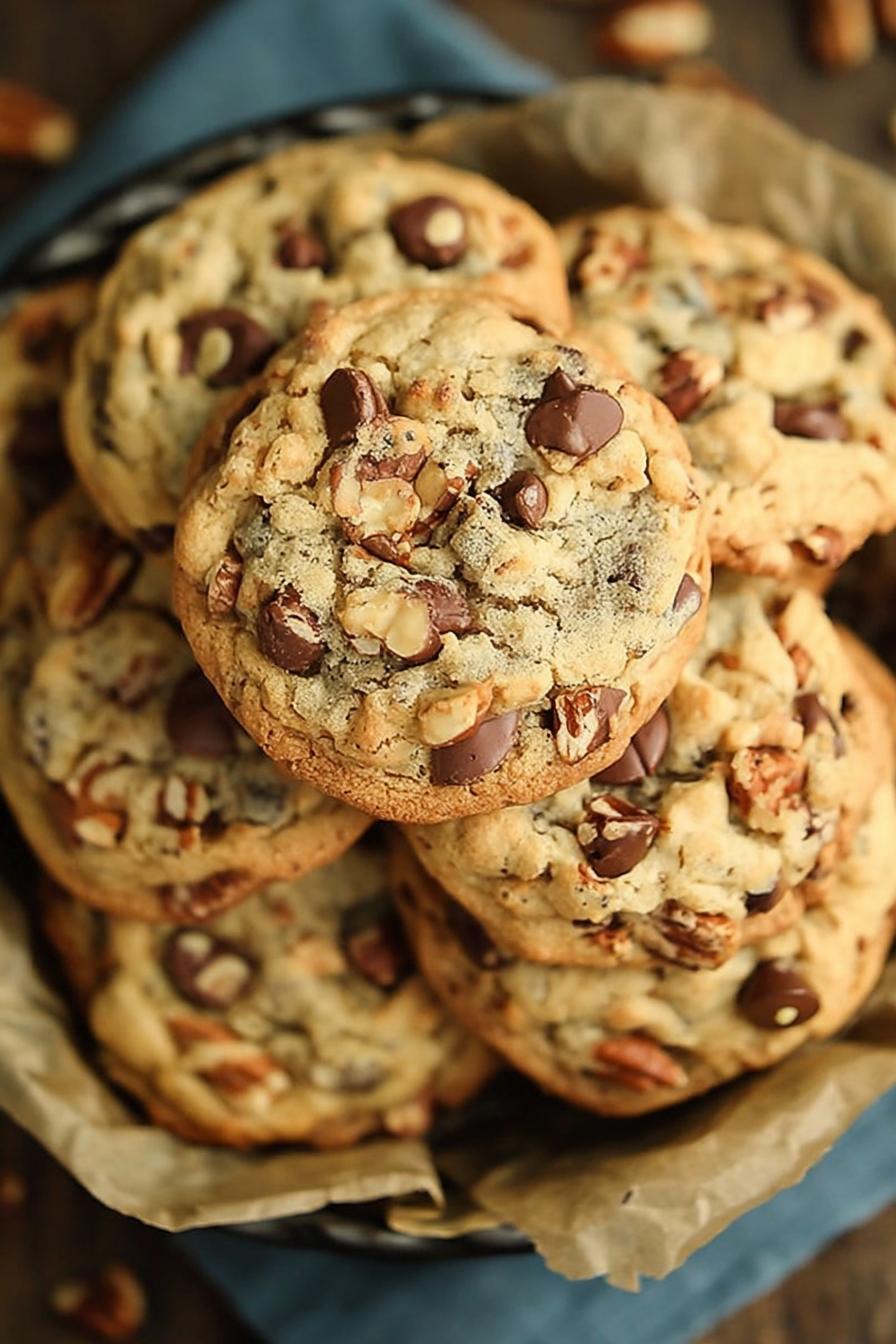 That crackling hit when chopping pecans—good sign. Warm nutty scent fills kitchen early. Butter must be soft not melting, helps sugars trap air; fluffier cookie. Brown sugar for moisture, granulated for snap. Eggs bind but keep too much air out. Flour needs sifting to avoid lumps, salt wakes up flavor, baking soda lifts gently. Watch dough texture, too loose = flat slabs. Chocolate chips melt slowly, offering gooey pockets. Nuts add crunch, toast them first to crack out oils, amplify aroma. Chill dough to firm fat, slows spread for thicker bites. Baking—edges gold, centers intact but soft. Patience on the rack finishes the job—hot cookies break, cool cookies snap with a clean bite.