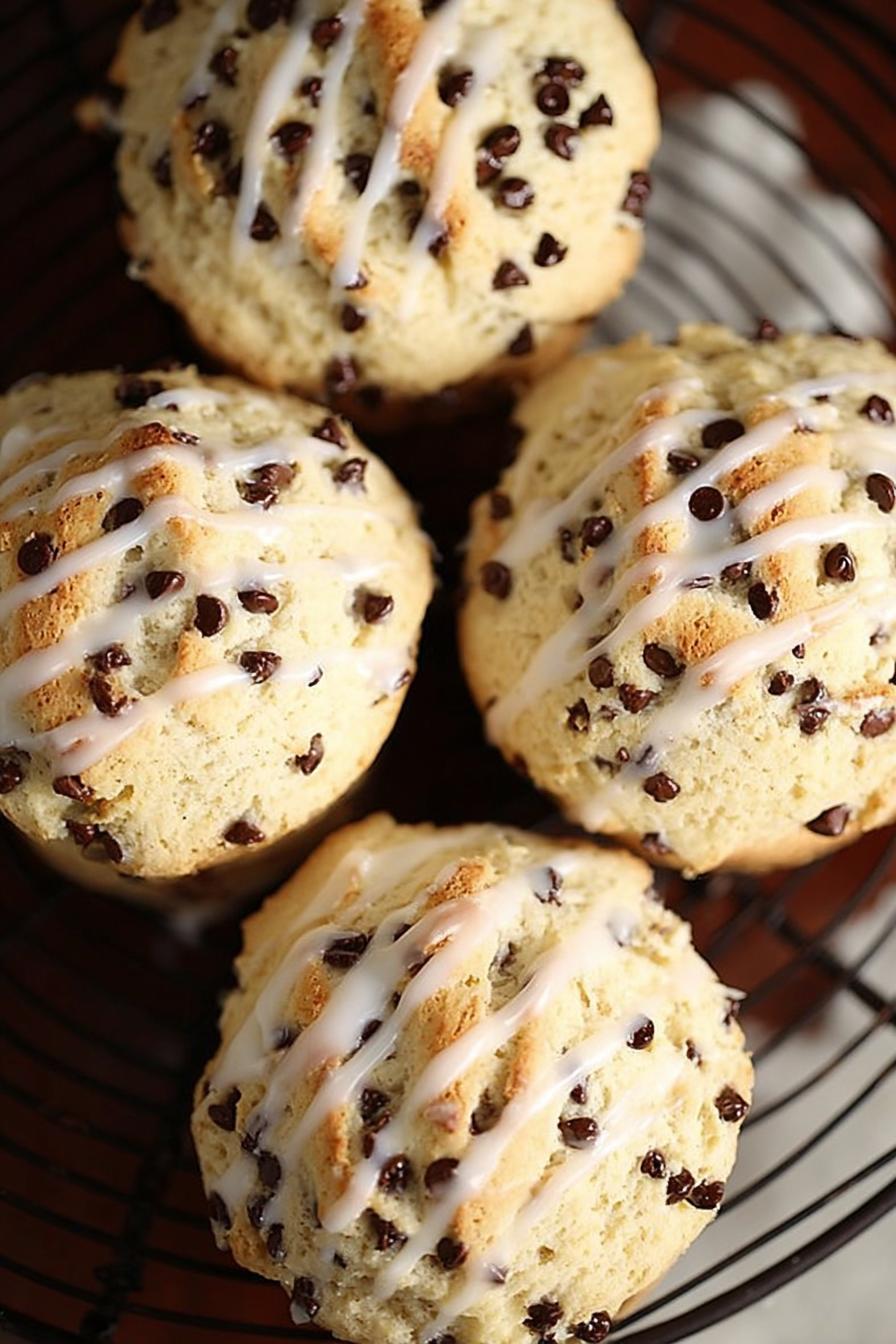 Spoon flour gently into your cup; never shake the measuring cup or pack it down. Too much flour kills tenderness. Cake flour thins the structure—don’t replace all with all-purpose unless you want denser biscuits. Coconut oil—subbing butter changes flavor and texture. Keep it frozen, grate immediately, or pieces won’t hold distinct layered lumps. Brown sugar must be packed, raw sugar isn’t a straightforward swap; dried molasses moisture improves biscuit softness. Kefir instead of buttermilk ups acidity and aids leavening subtly but richly. Heavy cream in drizzle can be swapped for whole milk but lose thickness; maple syrup adds depth. Chocolate chunks resist melting, chips tend to liquify faster, choose chunks if you want pockets of chewy chocolate instead of smooth melt through.