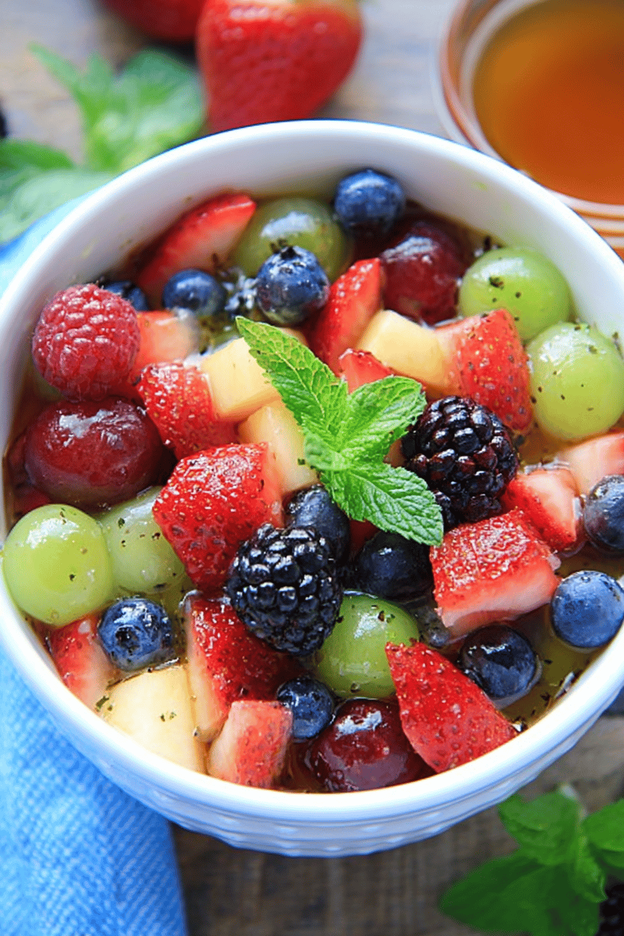 A fresh fruit salad boosted with a citrus-honey dressing, chopped basil instead of mint, and a bit of sea salt to punch flavors. Orange segments swapped in for some apples, plus a splash of lime juice alongside lemon for a balanced tartness. No cooking, just prep with keen attention on texture contrast and bright aroma. Mix, dress quickly, eat right away to keep freshness alive and avoid watery mush.
