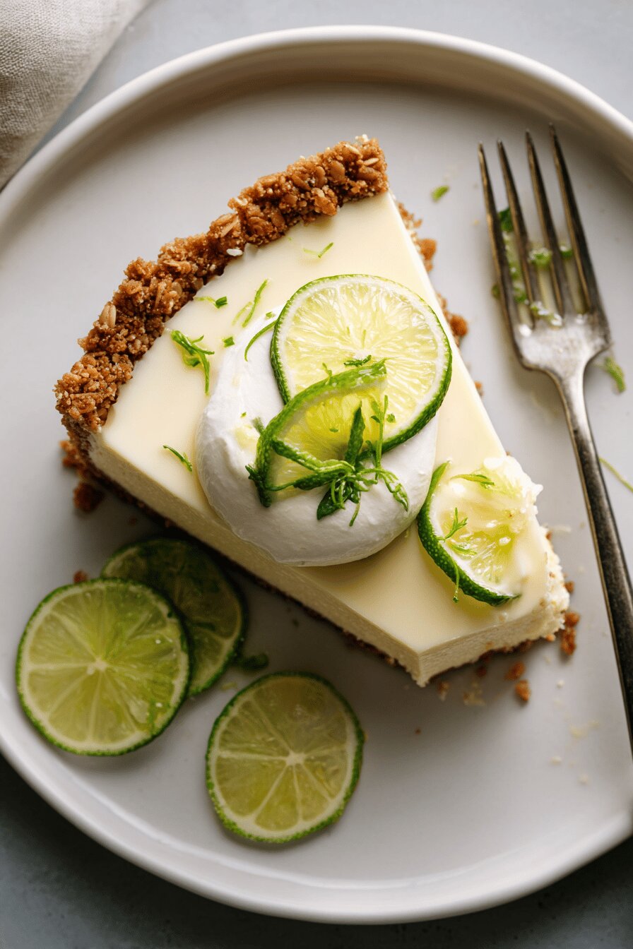 A rich cheesecake with a crispy oat crust and a zesty cream cheese-lime filling. Adjusted sugar and flour amounts for balance. Uses Greek yogurt instead of sour cream for tang and creaminess. Browned butter swapped for melted coconut oil in the crust for subtle caramel notes. Baked in a water bath to avoid cracks, wrapped securely in foil to trap moisture. Bake time varied slightly to react to oven hotspots. Cooling and chilling steps emphasized to perfect texture.