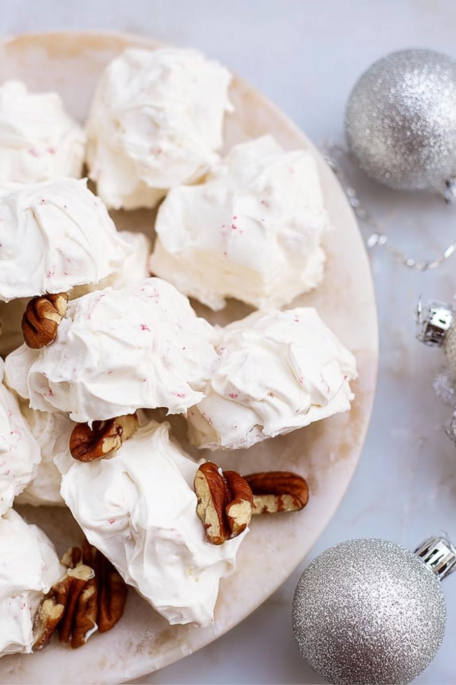 Sugar, syrup, and egg whites whipped into clouds of sweet fluff. The process demands precision. Sugar reaches soft ball stage—around 255-265 degrees—without stirring. Whisking egg whites separately until stiff peaks form sets structure, then folding in syrup slowly carries the air and moisture needed. Vanilla and nuts add texture and aroma. Cooling at room temp allows drying, not melting. Aim for glossy, thick, but not overmixed. Traditionally southern, updated with honey instead of corn syrup and pecans swapping walnuts. Small mounds, about a tablespoon. Make 35-40 pieces. Store airtight once fully set.