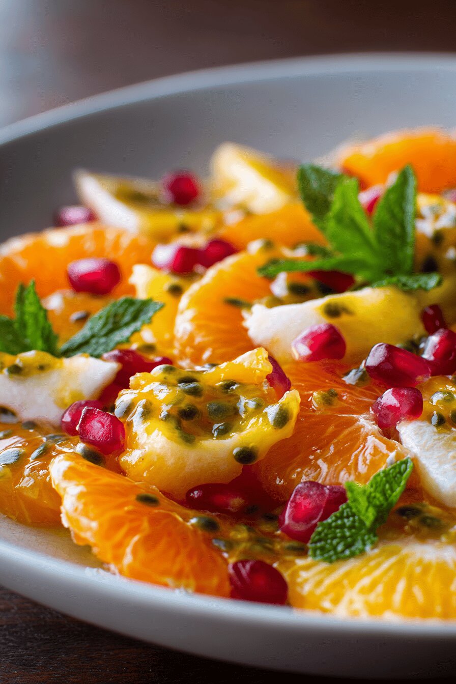 Mix maple syrup with passion fruit pulp first to help the syrup absorb the tart flavor. Add the fruit in layers, tossing gently so the slices donβt break. Letting the salad macerate for around 20 minutes softens the fruit slightly and releases juices. Stir just once or twice to keep fruit intact but evenly coated. No cooking needed, so prep quickly. Serve immediately after macerating for best texture, or refrigerate briefly if preferred chilled. Adjust resting time slightly if fruits are very firm or soft. Keep covered in fridge if holding for longer than 30 minutes. This salad works well as a light dessert or a refreshing side dish on warm days.