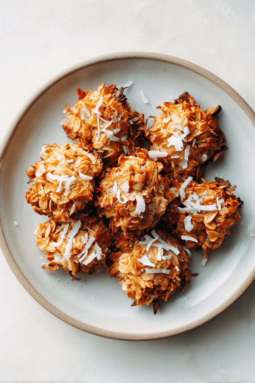 Rolled oats—a large flake size keeps bite and texture. Instant oats fall apart too fast, steal chew. Unsweetened shredded coconut is less oily than flakes; flakes add chunks but also fatiness that may burn sooner. Coconut oil outperforms neutral vegetable oils by giving richer aroma and better crystallization when cool. Maple syrup has balanced sweetness and viscosity for binding; liquid sweeteners with higher water content weaken clusters. Aquafaba whips better chilled—warm bowls or warmer syrup makes it weep and collapse. Coarse sea salt sprinkled on brings flavor lift against sweet. Precise measure important; too oily or too syrupy ruins clumping and baking consistency.