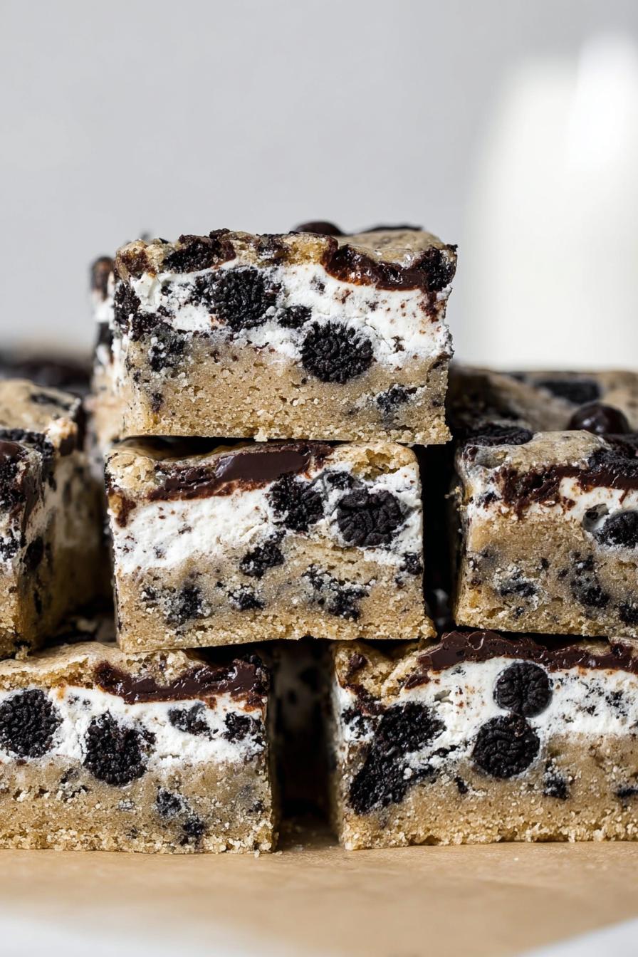 All-purpose flour can be partially swapped for oat or whole wheat flour to boost texture complexity but expect subtle flavor changes. Cornstarch softens tough edges and improves crumb so don’t skip it. Baking powder and soda together balance rise and browning; missing either risks dense or flat bars. Butter must be softened but cold butter chunks create pockets of flakiness—message: know your butter state before mixing. White and light brown sugars combine crisp and chewiness; brown sugar’s molasses content holds moisture and flavor. Vanilla extract’s importance often overlooked—it brings depth. Eggs and yolks hydrate and bind but adding too much risks dense texture—stick to given amounts. Oreos and cookies and cream candy bars add recognizable crunch and cream flavors—a twist is substituting white chocolate chunks for mini chocolate chips to up sweetness with sharper melt. Pantry substitutions possible but expect flavor and texture tweaks. Allergic? Use sunflower seed butter instead of butter but monitor baking time carefully.