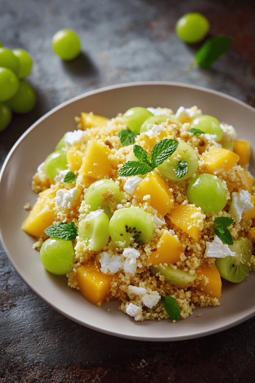 Start with cold juice reserved to briefly marinate fruit—this step infuses flavor without cooking fruit. Warm juice just below boil before pouring over couscous; bubbles at edges signal right temp for quick hydration without scorching. Cover same-size pot or bowl tightly to trap steam; steam, not boiling water, does the swelling—it prevents grain sogginess. Wait 6-7 minutes, not exact, but when volume doubles and you see plump grains slightly translucent. Fluff gently with fork—avoid stirring too hard or stirring with spoon that can mash grains into paste. Dice fruit on dry board right before adding to maintain texture and juices. Combine couscous cooled completely so yogurt does not break down or curdle. Gentle folding keeps creaminess intact. For serving: fresh grapes layered on top for textural pop. Chilling tightens flavors; if in urgent need, room temp still tasty with fruity aroma hitting first. Watch out for over-steeping couscous—if grains stick, loosen with a splash cold juice or yogurt. Mint is last-minute for freshness; bruised leaves turn bitter, so just tear gently or chiffonade. Any swap in ingredients demands extra tasting and adjusting sweetness and acidity. Timing is flexible but rely on sensory cues—soft, plump couscous, firm but juicy fruit, fresh aroma, creamy but airy yogurt mix.