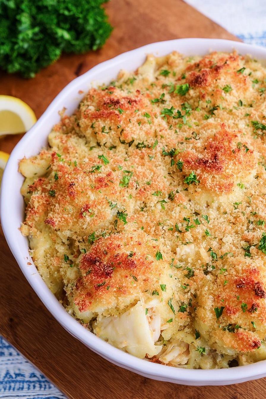 A baked crab custard with swapped ingredients—panko bread crumbs swapped for crushed Ritz crackers and mayonnaise swapped for Greek yogurt. Adjusted quantities to 70% original. Aromatic shallots and garlic meld with lemon and parsley. Lemon zest and juice brighten the rich crab meat. The topping crisps golden, signaling pull from the oven. Baked until bubbling gently and bronzed on top. Serve with fresh lemon wedges or a tangy aioli. Timing flexible depending on dish depth. Techniques focus on handling crab gently to keep lumps intact and balancing moisture to avoid soggy texture.