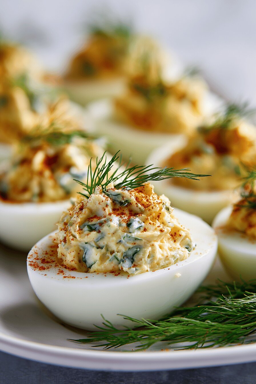 Halved hard-boiled eggs filled with a creamy crab mixture subtly flavored with dill and lemon zest. Uses Greek yogurt instead of mayo for tang and lighter texture. Tarragon swapped partially for dill, adding a fresher profile. Eggs gently simmered then rested off-heat to avoid overcooking and green yolk rings. Crab chunks folded in carefully to keep texture intact. Garnished with dill sprigs. Adaptable for dairy-free by replacing yogurt with avocado mash or vegan mayo. Yolk reserved for salad topping. Quick chill in fridge before serving to firm up filling. Balance acidity and salt in dressing to avoid overpowering delicate crab flavor.