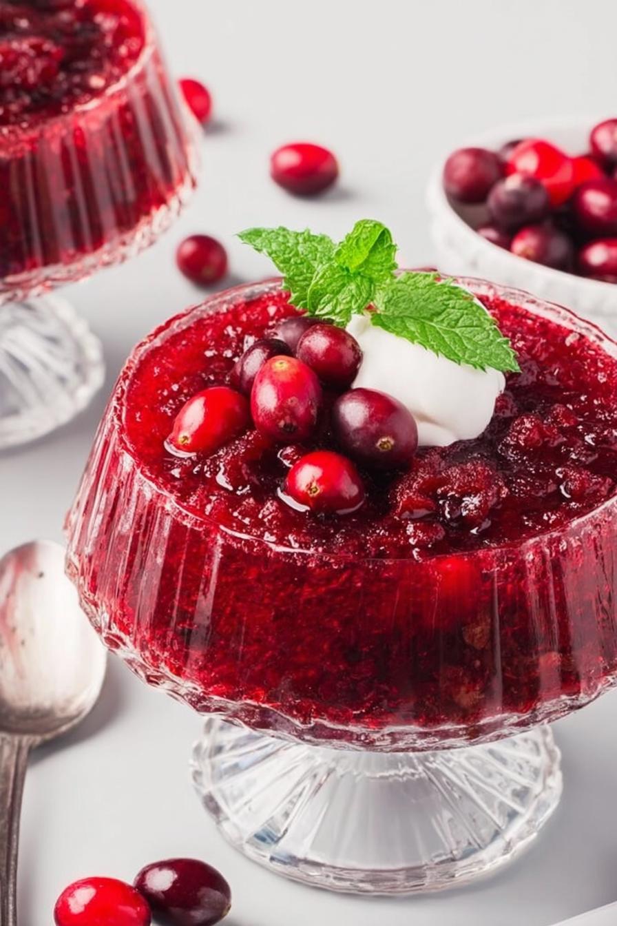 Cold-set gelatin salad with cranberry, juice swap and walnuts instead of pecans. Pineapple introduces moisture balance and sweetness contrast. Heavy cream whipped separately to soft peaks adds airy richness on top rather than mixed in. Textural variation with chunky cranberry sauce against smooth gelatin and crunchy nuts. Low sodium, moderate sugar content makes it accessible. Set firm but jiggle still visible, not rock solid mold. Refreshing winter side with fresh lemon juice brightening instead of straight straight cranberry juice. Fresh lavender leaves for garnish if you want a reset to usual mint. Can make ahead easily, holds shape well chilled.