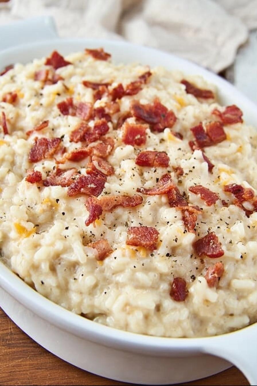 Bite-sized bacon pieces crisped to just past chewy. Onion soft and glossy, caramelizing edges releasing sweetness. Garlic hits aromatic instantly, don’t burn it, just 45 seconds. Half and half with softened cream cheese, stirred till silky and melted, no lumps. Parmesan and mozzarella folded in slowly, melting gradually to creamy strands. Rice folded in last, absorbs all richness. Black pepper cracked fresh at the end. Swapping bacon for pancetta adds smoky depth or turkey bacon for lighter, leaner fat. Uses Monterey Jack and Pecorino Romano instead of mozzarella and parmesan for bite and nuttiness. Timing visually and tactilely, not clocks, guide doneness.