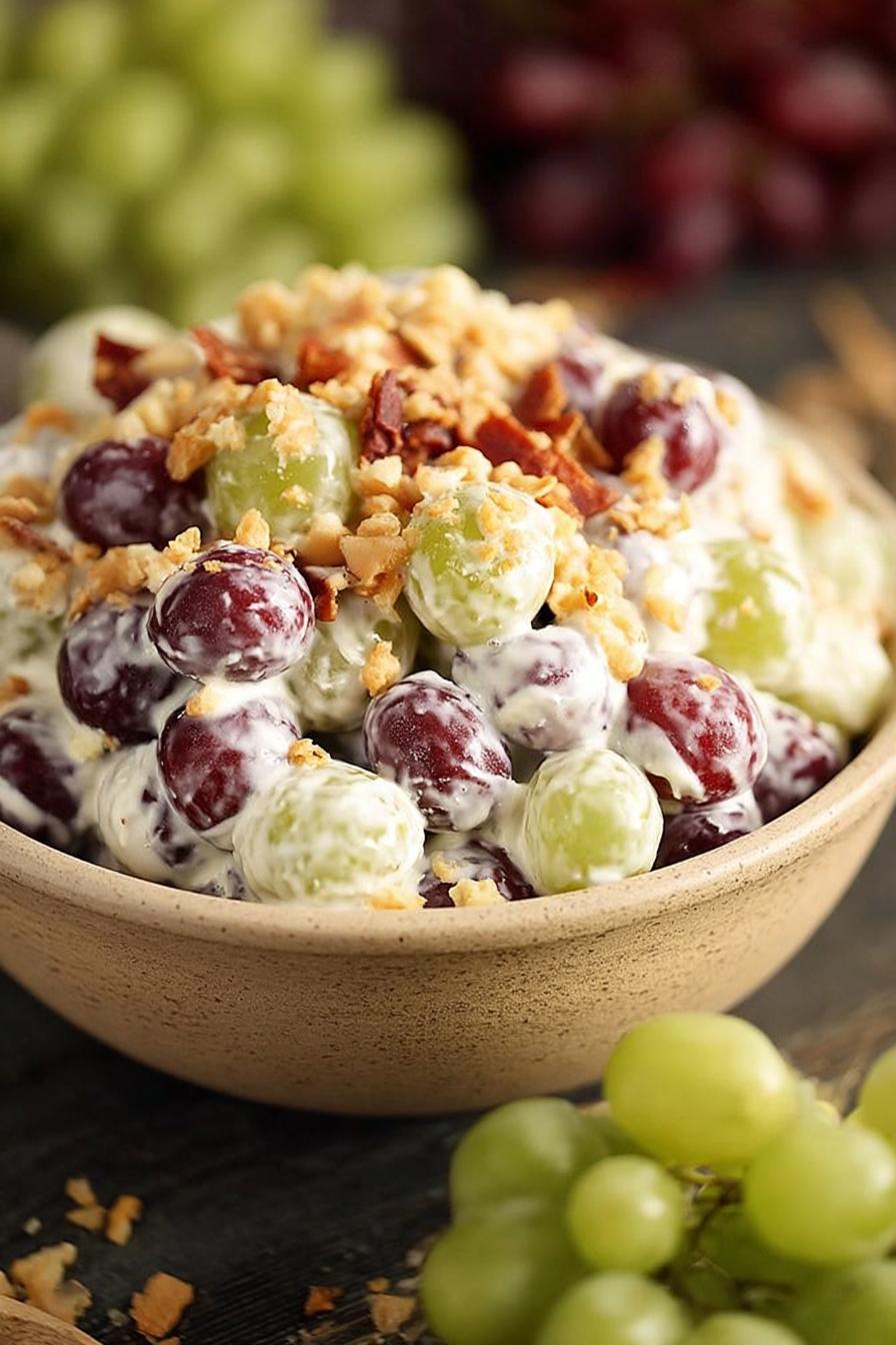 Think grape salad but reworked from scratch. Soft mascarpone creamy without the tang battle of cream cheese. Greek yogurt adds just enough bite to keep it lively. Sweetness comes from real maple syrup not granulated sugar—deeper, richer, less fake. Toss in a hint of cinnamon to add warmth, subtle spice mingling with fruit. Toasting nuts wakes up flavor and texture. Almonds provide crunch but also punch of earthiness. Coconut flakes for unexpected textural contrast, sweet and lightly crisp. Chill briefly so dressing sets but grapes stay tender, juicy, not soggy. Ideal for potlucks where you want something easy but not boring. No fluff, just technique. Why dry grapes first? Moisture ruins consistency. Why fold not stir? Preserve grape shape. These little things matter.