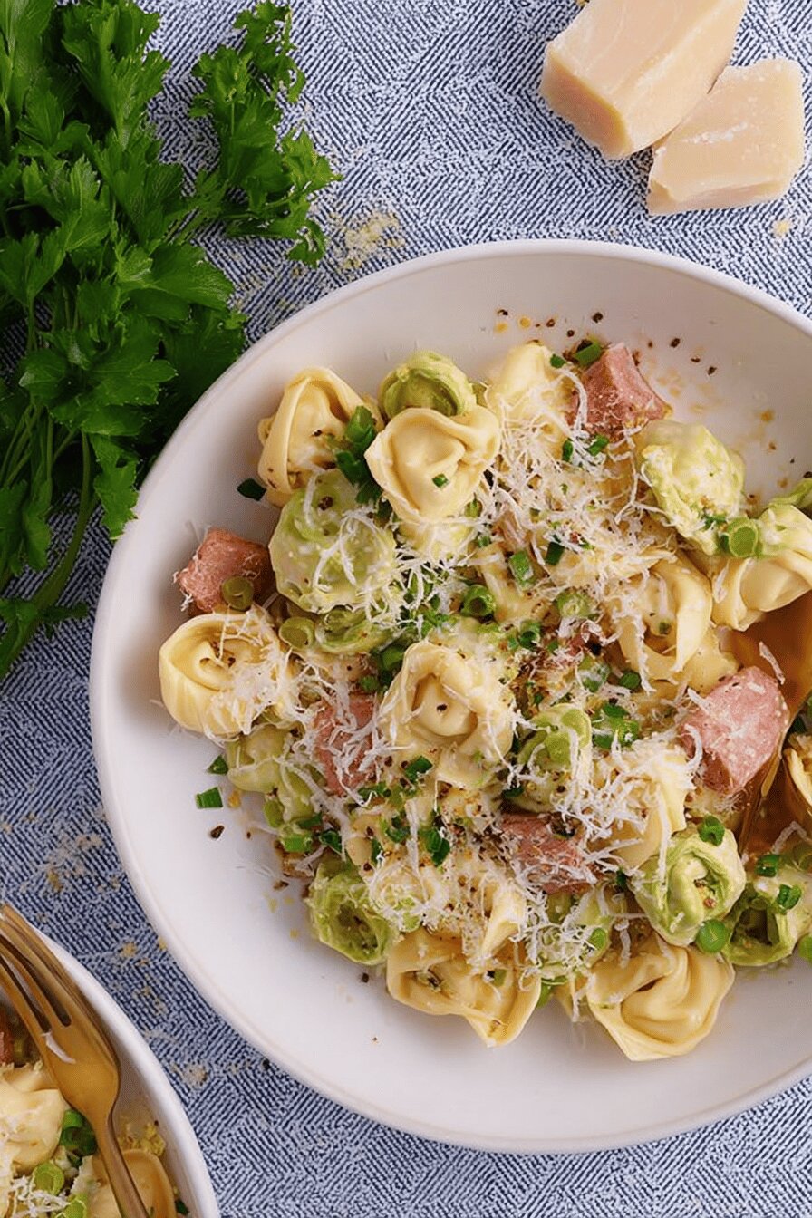 Rich, creamy pasta tossed with browned smoked pork cubes, fresh cheese tortellini, and green peas. Uses a lightly thickened cream and Parmesan sauce with garlic aroma. Salt balances, black pepper adds bite. Simple, quick, and flexible for swaps.