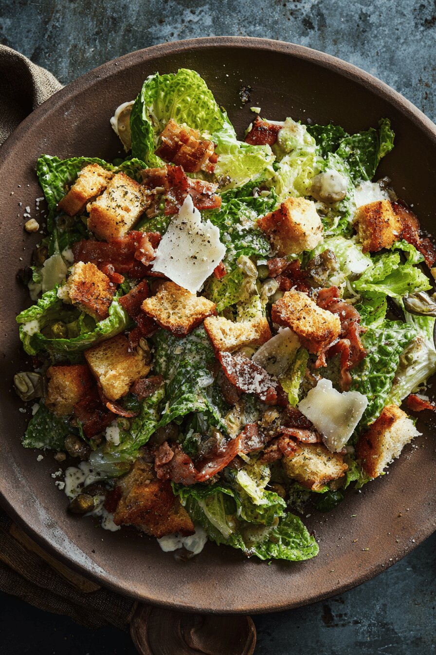 A classic Caesar salad reworked with lightly toasted sourdough cubes and smoky pancetta instead of bacon. Creamy, tangy dressing emulsified in bowls, anchored by anchovy paste and capers. Freshly shredded aged Parmesan folded in for sharp texture contrast. Romaine torn by hand, dressed while still damp for gloss. Crunch from croutons and crispy pancetta balanced with smooth dressing. Precise heat control, timing for toasty bread and rendered fat critical. No mayo store-bought shortcuts; emulsify slowly to avoid break. Flexible with oil types; can swap lemon for lime for a bright lift. Classic techniques, practical tweaks to prevent bitterness or over-salting.