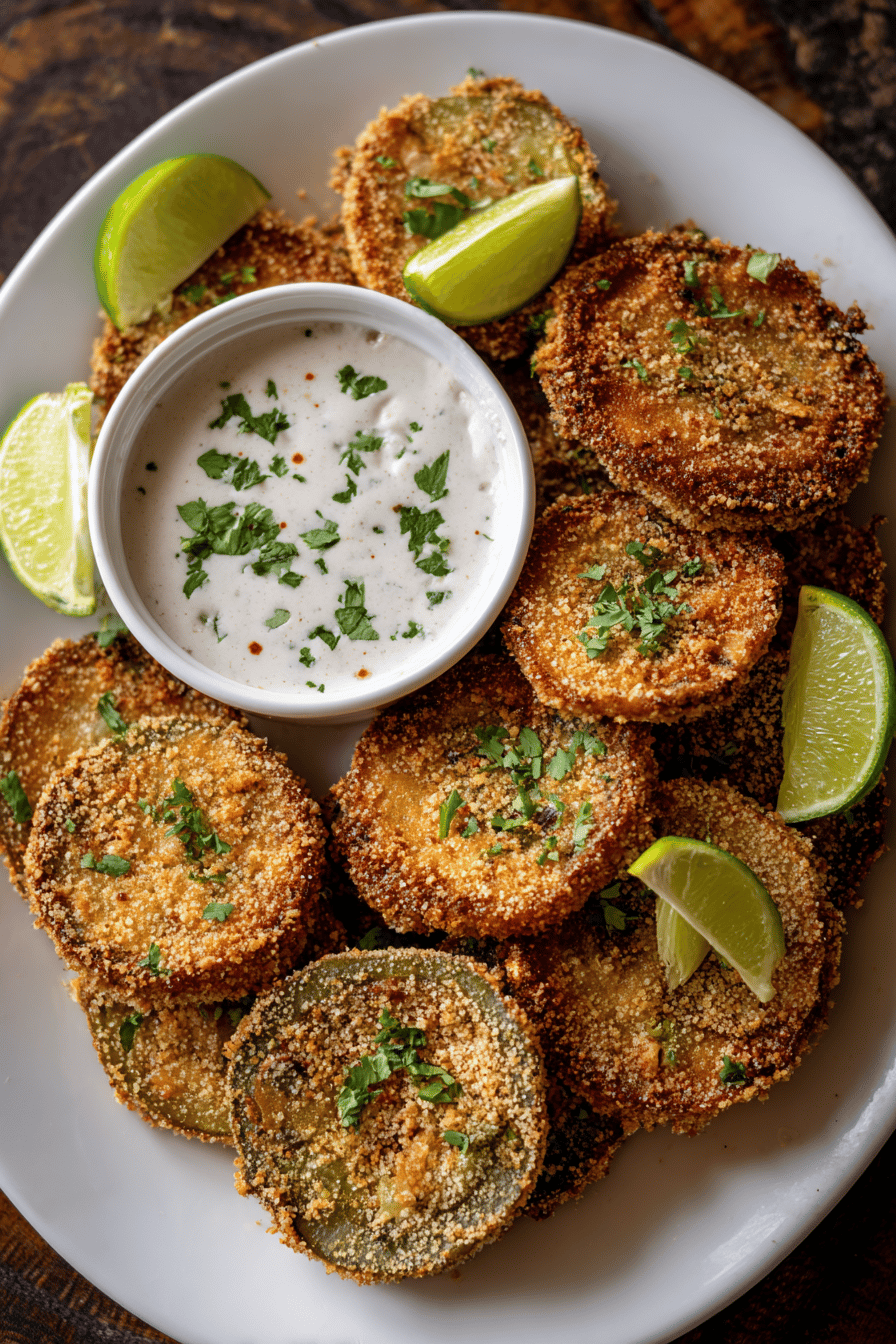 Green tomatoes sturdy, grassy tang cuts through rich frying fat. Coating ’s not just about flour and egg—texture matters. Tortilla chips crushed for rustic crunchy shell. Oil sizzling, smell turning golden, edges crisp, listening for that frying rhythm. Dip smoky, lime bright, garlic sharp flattened into creamy base. Scorch risk with rice flour, so eyes peeled. Layers of salt, sugar, spice mixed for balance. Never fry crowded—oil temp tanked, soggy mess guaranteed. Rest slices to firm, salty finish right after out of oil. Vegetables raw, cool, crisp contrast to piping hot fried slices — balance or bust. Some days swap yeast flakes for smoky undertone or swap paprika for chipotle powder to twist flavor. Every part plays a role. Every cue guides you. Don’t guess—watch, touch, smell. Kitchen’s alive.