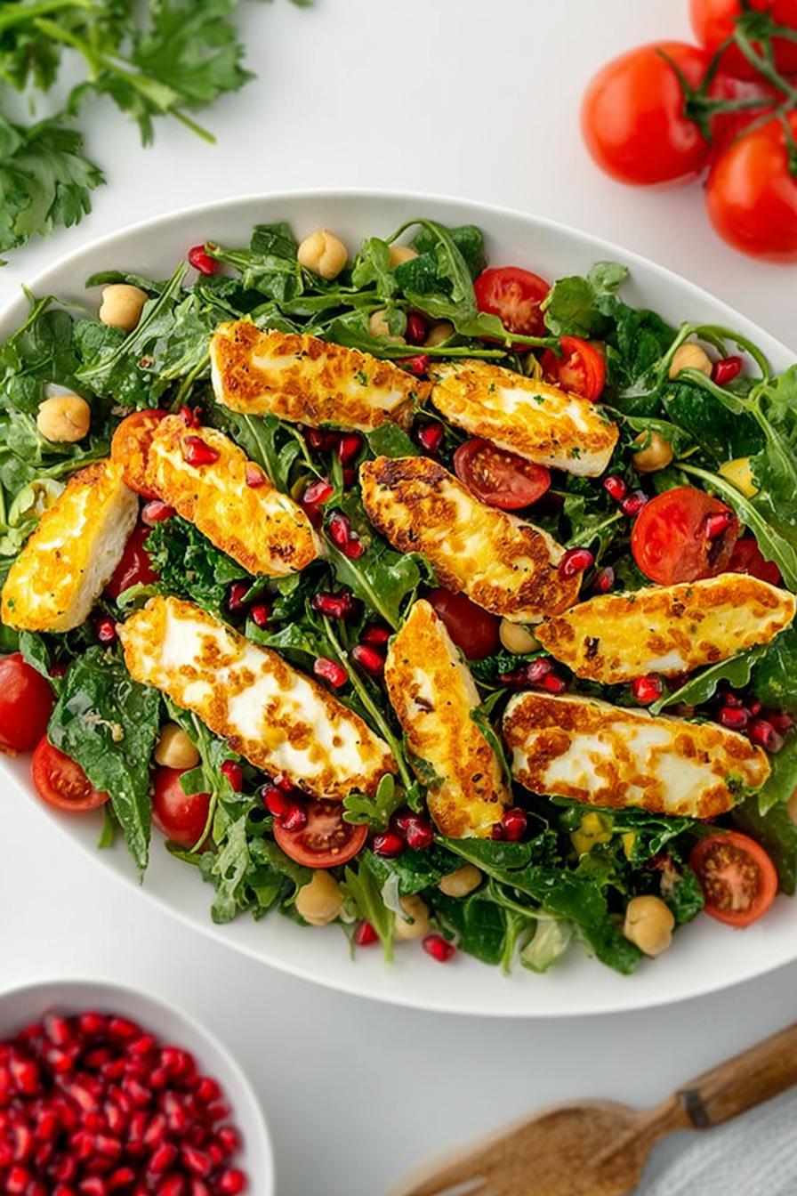 Greens tossed with chickpeas, olives, and juicy bursts of pomegranate. Not just any chickpeas though–both creamy canned and these punchy crispy ones add layers. Then halloumi—salted, squeaky, dense. Proper searing unlocks nutty, deep notes, avoids that rubbery bounce everyone complains about. Trust the crust. Swap oil; sesame for olive—nuttier, richer. Tang from white wine vinegar with lime zest cleanses through. Sun-dried tomatoes sneak in, chewy and bright, a departure from roasted reds but just as punchy. Visual cues—golden edges not just a time stamp. Hear the sizzle fade, scents change, surfaces shift from slick to porous. Tools here matter, cast iron preferred for steady even heat. Rinse chickpeas well to remove canned tin tang. Resting plate lined with paper towel kills extra grease stealthily. Each part fast but intentional. Texture combo, room temp vinaigrette, warm cheese, cool crisp salad. The contrast is what’s working. Plate smart, dress last minute. No sog, no rubber balls of cheese–real texture harmony. Straight up kitchen sense, no fluff.