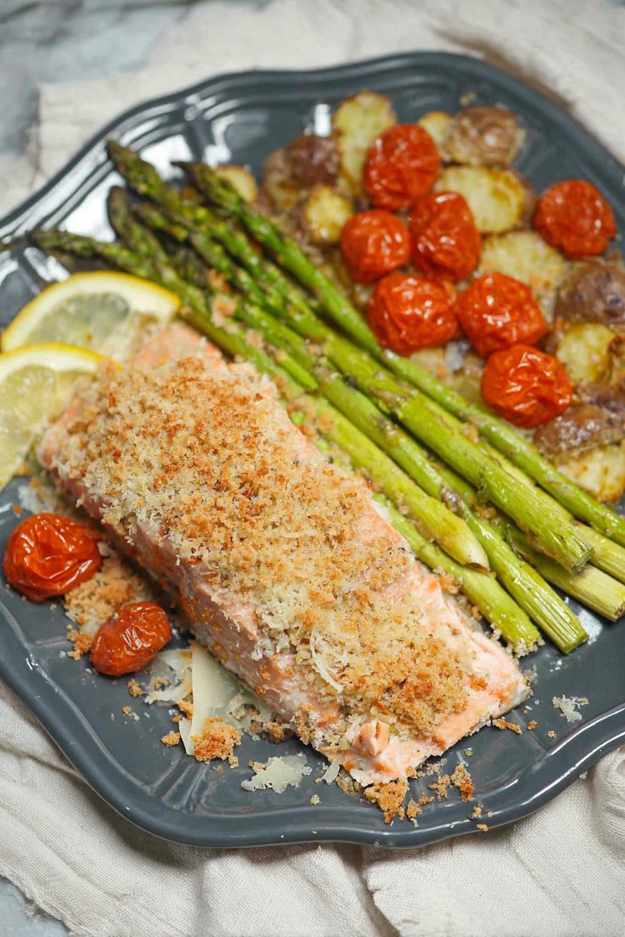 Salmon baked on lemon slices with cherry tomatoes and asparagus. Crunchy panko and walnut topping. Asiago cheese on veggies. Watch for white protein strands as the fish cooks. Foil trick if crumbs brown too fast. Simple, quick sheet pan meal with subtle changes for texture and flavor balance.
