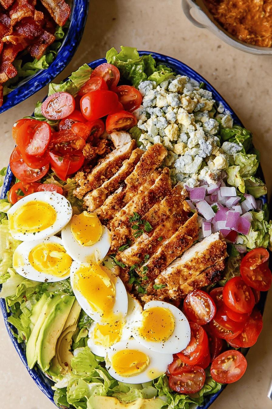 A vibrant salad with crispy baked chicken strips coated in crushed cornflakes and Parmesan blended with Italian herbs. Loaded with romaine, hard-boiled eggs, smoky turkey bacon, ripe avocado, cherry tomatoes, and crumbled blue cheese. Tossed lightly with a tangy balsamic vinaigrette featuring garlic, Dijon, and a touch of honey. Variations include swapping turkey bacon for pancetta and blue cheese for feta. Baking ensures a crisp crust without deep frying. The chicken is pounded thin for even cooking. Timing relies on visual cues: golden crust, internal temp 165°F. A texture play between crunchy, creamy, and fresh elements.