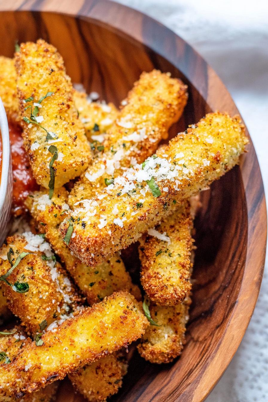 Mozzarella sticks fried until golden with a crunchy crust. Uses Italian-seasoned panko and flour for breading. Eggs mixed with cream replace milk for richer binding. Cheese cut into uniform halves ensures even cooking. Double dip breading creates thick crust that holds cheese melt inside. Deep-fried in peanut oil at 355 F for a crisp exterior without cheese leaks. Frozen before frying to prevent melting too fast. Serve with spicy arrabbiata or classic ranch. Adjust oil temperature by shimmer and light bubbles, not clock. Common issue: cheese escape solved by thorough, cold breading. A crispy snack with gooey inside, reliable every time.