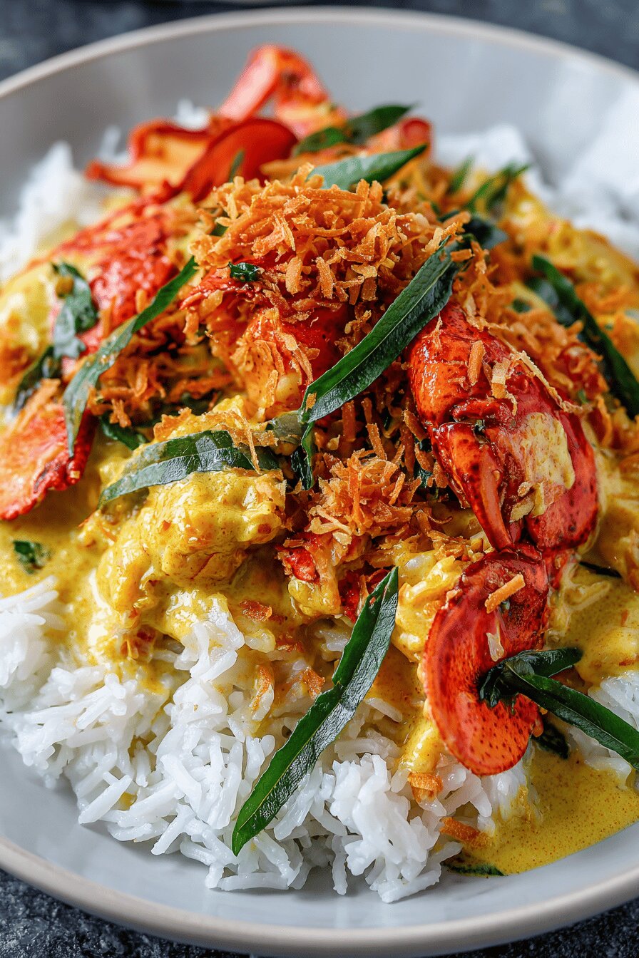 A quick savory curry with lobster chunks cooked in creamy coconut milk and a spice mix featuring cumin and turmeric instead of traditional garam masala. Fresh aromatics pureed for consistency and depth. Finished with shredded coconut for texture and toasts slightly in the pan. Served best over fragrant jasmine rice. Dairy and gluten free. No eggs or nuts. Adjust spice level by varying the curry powder. Lobster can be swapped with shrimp or crab meat in a pinch. Essential to watch the coconut milk simmer and thicken slightly without breaking. Flavor builds quickly—don’t overcook the shellfish. Subtle coconut oil can replace olive oil for added flavor. Salting at the end keeps lobster tender.