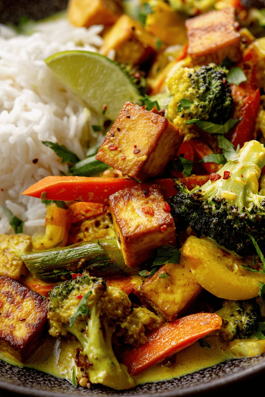 Firm tofu cubes fried crisp. Mixed veggies softened but crisp. Curry powder and coconut milk bring heat and creaminess. Lime zest and juice add sharpness. Sambal oelek for a spicy kick. Onion and garlic build base flavors. Cook veggies al dente. Serve with rice if you want. No nuts, gluten, dairy, eggs. Vegan and practical. Quick for dinner or meal prep.