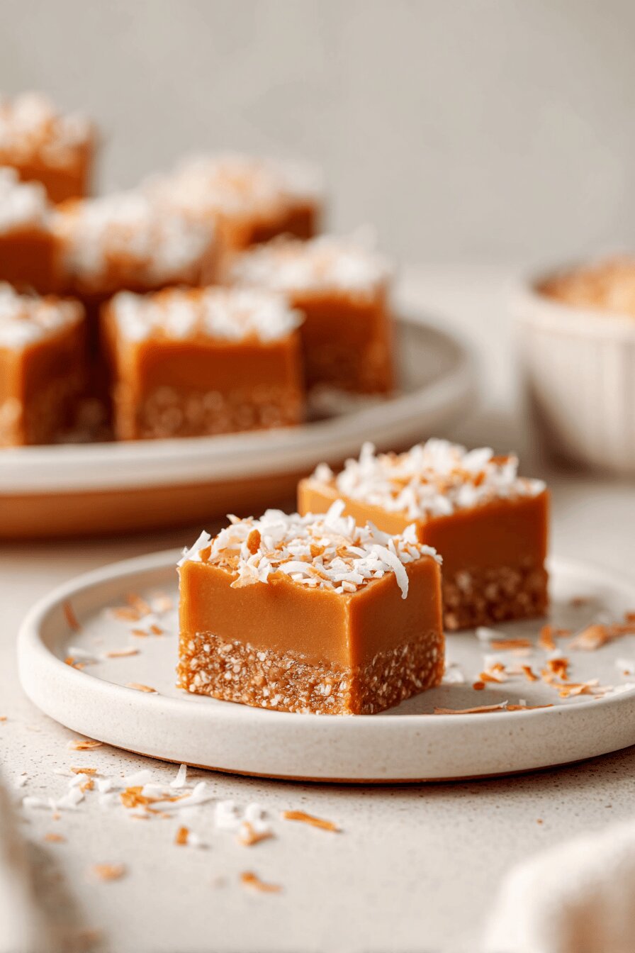 Cream candy sans dairy or nuts. Switched to oat cream over soya for gentler palate and less risk of protein separation. Brown and coconut sugars mingle, maple syrup keeps sticky chew alongside mashed sweet potato for subtle moisture boost—natural sugars slow crystallization. No stirring when boiling; bubbles and shifting edges tell the tale. Watch that thermometer but listen too: soft crackling, color deepening softly, aroma shifting to warm caramel wafts. Cool well. Beat until mix turns opaque, a bit thick. Toasted coconut optional but throws welcome unpredictability in texture. Set in parchment, firm or soft depends on chill or not. Cut sharp. Simple tweaks, strong results.