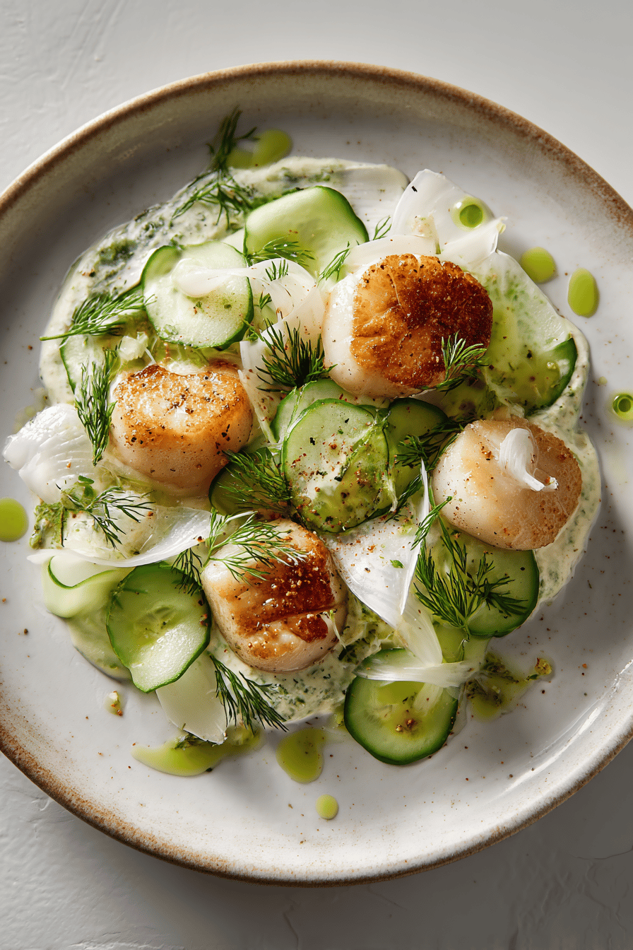 Scallops sliced thin, flowered with dill oil, paired with quick-pickled cucumber and a creamy dill yogurt sauce. Shards of kohlrabi and cucumber provide crunch. Buttermilk adds tang and smooths the oil. The scallops are seasoned lightly with sea salt—overdoing kills the delicate flesh. A slight acid snap in pickled cucumber cuts richness. Dill oil made by blanching and blitzing fresh dill into neutral oil then strained. Yogurt sauce sharp with dijon and lemon, balanced by garlic and fresh dill. Serve immediately once plated to keep textures bright and fresh.