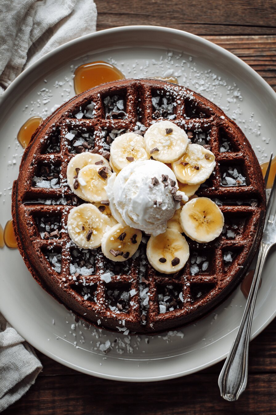 Serve Sprinkle flaked sea salt on hot waffles to contrast chocolate’s bitterness. Pair with plain Greek yogurt or tart cherry compote if desired.