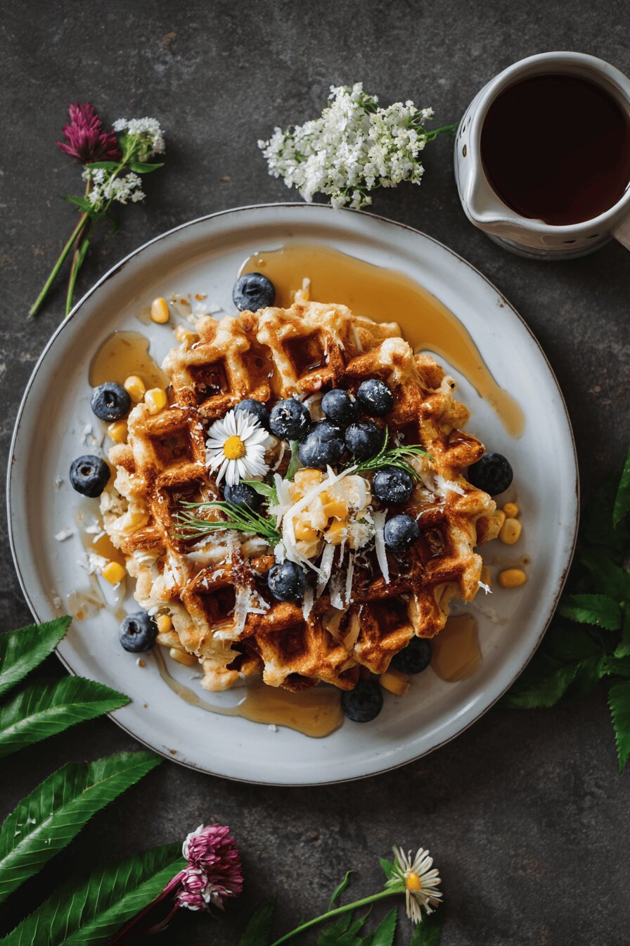 Resting the batter post-mixing lets starch absorb and gluten relax, which avoids gummy waffles—not the same as resting for yeast rise, but crucial. The corn kernels fold-in last to preserve texture; over-mixing can crush starch and lead to pasty batter. Preheat your waffle maker well—if it’s too cold, batter soaks in and waffles wilt; too hot, edges burn and inside stays raw. Wait for steam escape sounds turning quieter; that’s moisture leaving and waffle setting. Don’t rush opening; too soon, waffles tear, too late, they stick or burn. Let waffles cool directly on a rack to keep crisp, stacking while hot traps steam and ruins texture. Leftovers reheat in toaster oven or air fryer; microwave ruins crisp. Have backup oil for greasing in case batter sticks—spray preferred for even coating.