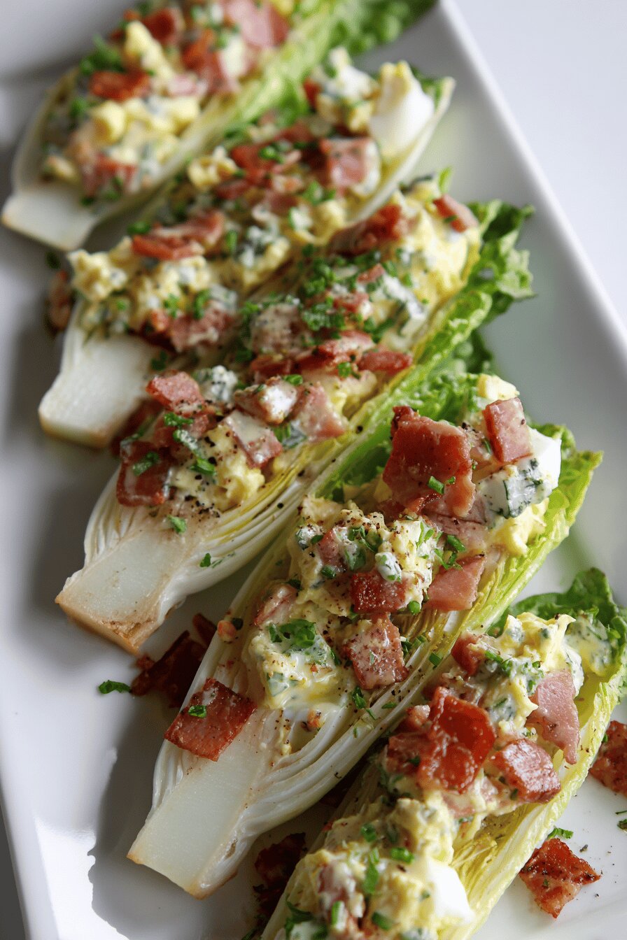 Eggs poached to firm tender, diced crisp bacon, crunchy bread cubes pan toasty in bacon fat; creamy tangy mustard-mayo mix binds celery freshness and snipped herbs. Endives split to hold generous pockets. Cold or near room temp plate. Simple swap turkey bacon, rye bread cubes. Watch eggs timing to avoid overcook. Quick sear bacon, save fat for toasties adds punch and texture contrast. Balance savory crunch with smooth egg filling. Perfect for a make-ahead starter or light snack.