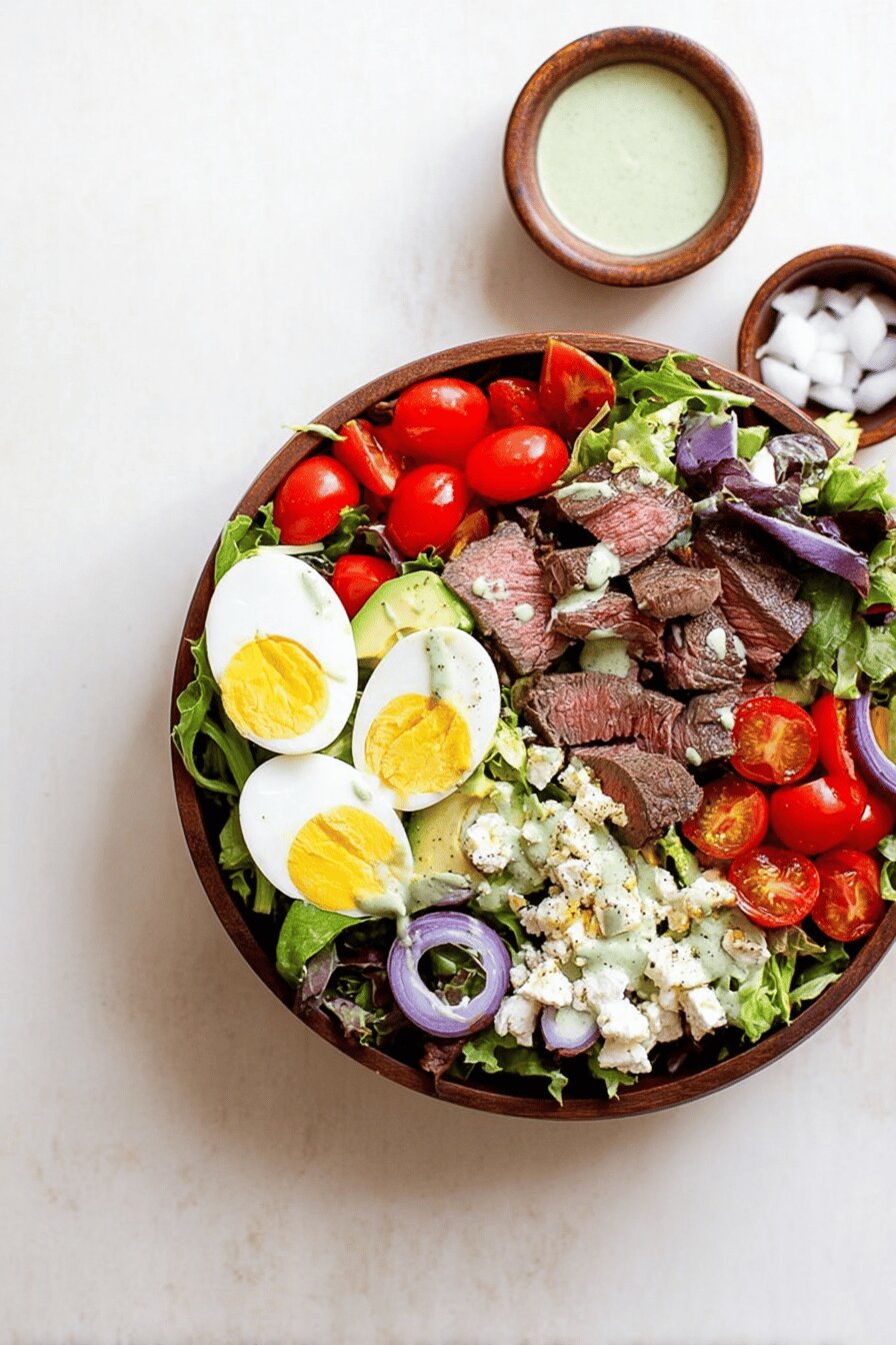 - 💡 Layer your salad right before serving. Greens first for base—keeps them crisp. Warm steak contrasts cold veggies. Visual appeal matters.