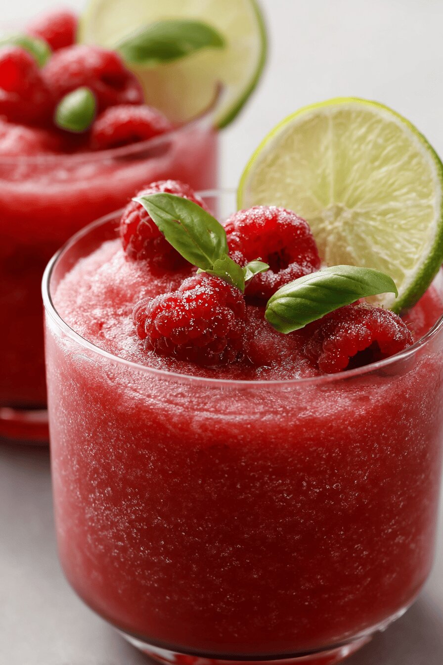 Cutting sugar a bit helps keep it from clumpy ice blocks. Raspberries replace strawberries adding a deeper, tangier note and more seeds for texture. Fresh basil, torn or whole, brightens the flavors and offsets sweetness with herbal freshness. Lime juice sharper than lemon adds crisp acidity. Water dilutes the puree just enough, making the slush blend smooth but not too watery once frozen rosé added in. The rosé quantity reduced by 30% to keep the sweetness and chill balanced. All ingredients should be chilled beforehand for best freezing results.
