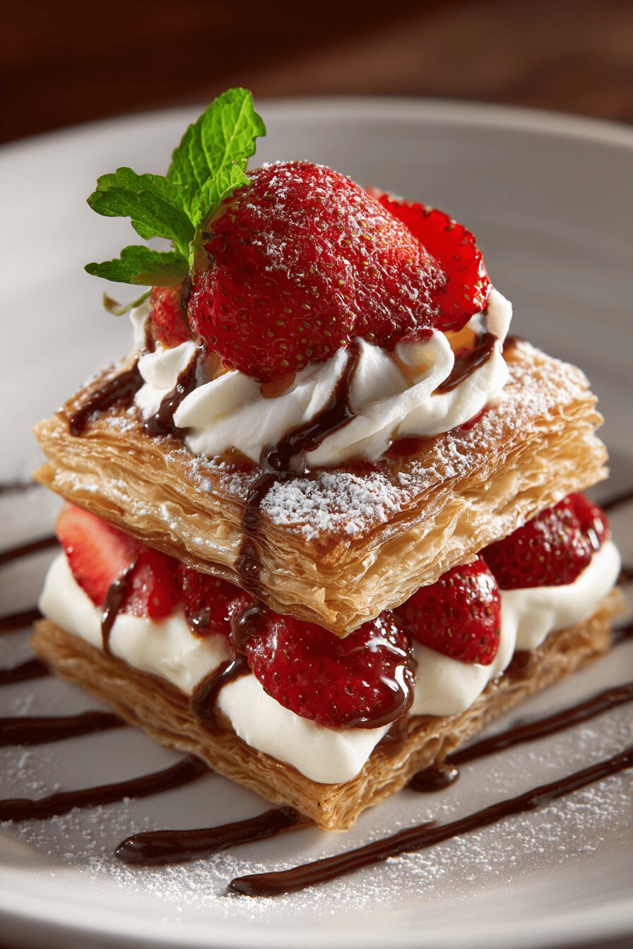 Puff pastry slabs coated with a buttery cinnamon-sugar blend. Whipped cream sweetened with powdered sugar and a splash of almond extract. Strawberry jam swapped for apricot. Chocolate sauce made from milk chocolate and cream, melted and cooled. Sliced strawberries macerated with honey instead of granulated sugar. Serve frozen creamy layers topped with fruity berries and a drizzle of velvety chocolate. Chill times shortened or extended by a few minutes for texture adjustment.