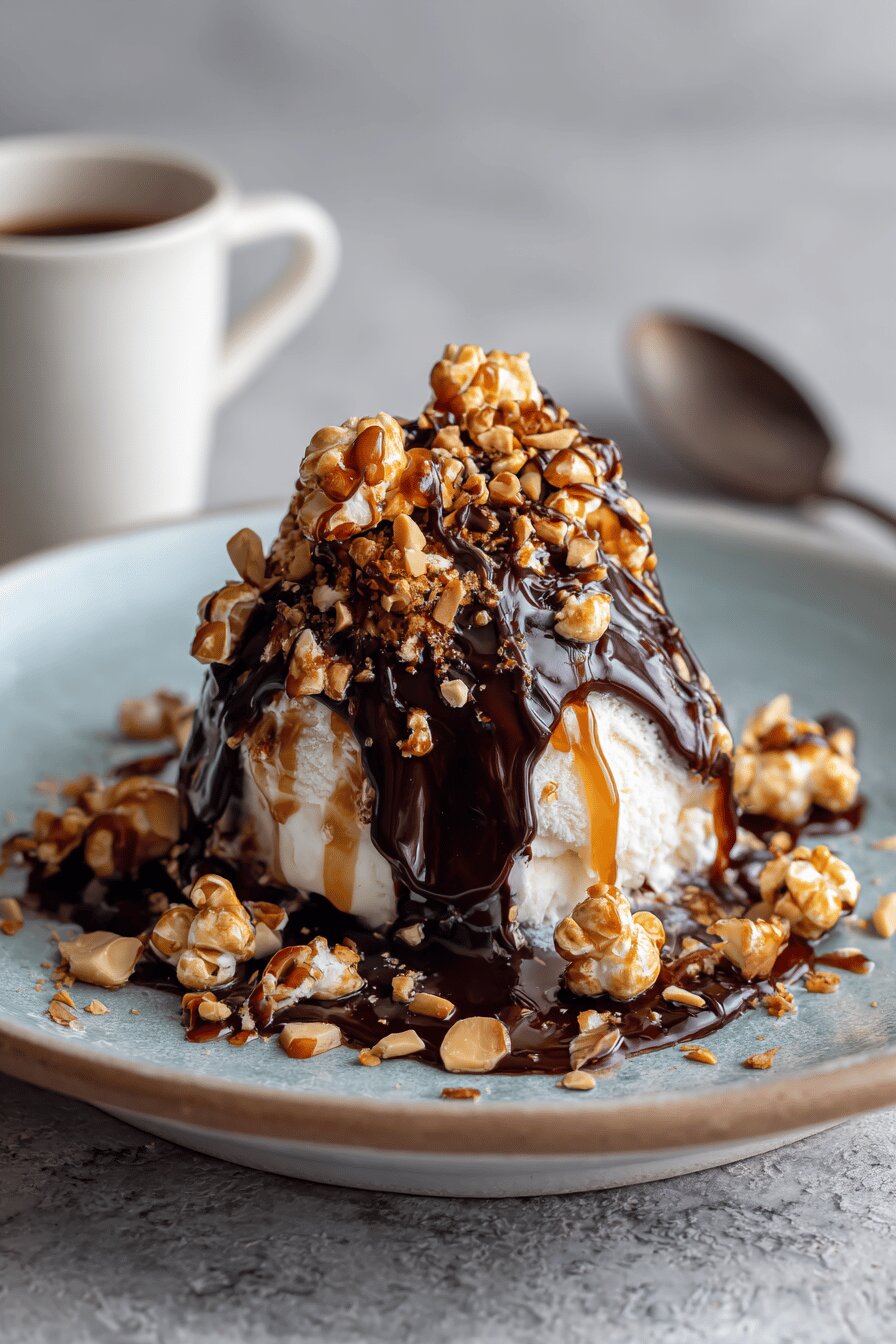 Working on a sundae that breaks the usual mold. Forget cloying, heavy fudge that hardens into a brick; this fudge sauce melts luxuriously with a velvet texture that clings without sliding off. The caramel popcorn isn’t just a sweet crunch — it’s buttered popcorn caramelized for flavor depth. Roasted almonds replace peanuts, offering a woodsy richness and less allergen risk. Coconut cream to thicken fudge brings a subtle tropical creaminess that’s worth the jump from dairy. Watch for visual cues — bubbles form at the edges, fat grease shines, thickness tells you when to stop heating. Serve in chilled glasses so every bite contrasts cold ice cream and the still-warm chocolate sauce. A sprinkle of flaky salt makes all the sweetness pop — all done in under 25 minutes. Quick but mindful. Good sunlit dessert with controlled textures and fresh caramel notes.