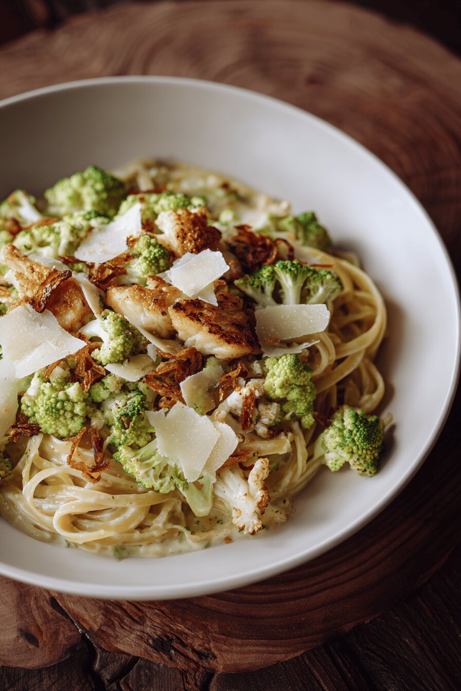 Linguines tossed in a rich garlic cream sauce with finely chopped Romanesco instead of broccoli, tender roasted cauliflower, and crispy shallot chips. Reduced chicken stock forms the base of the sauce, thickened with arrowroot starch. Olive oil and browned garlic meld with the creamy sauce, coating al dente pasta. Parmesan shards add savory saltiness. A quick sauté develops aroma and texture in the vegetables, contrasting softness and crunch. Swap shallots for garlic chips to introduce mild sweetness and complexity. Timing hinges on tender-crisp cruciferous veggies and sauce consistency.