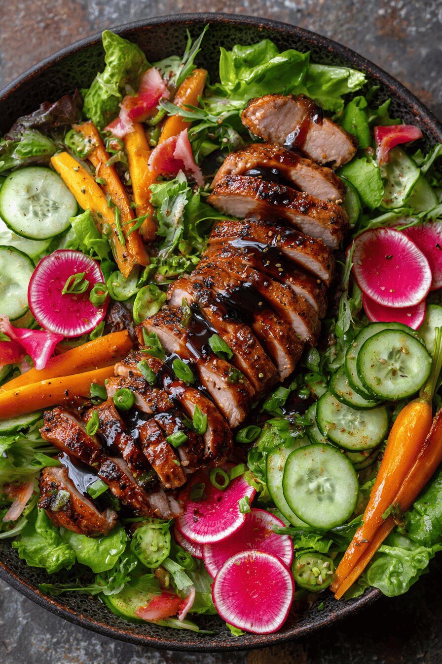 Pork tenderloin marinated then seared and roasted with a sticky glaze. Paired with quick-pickled rainbow carrots and watermelon radishes for a crunchy, tangy punch. Fresh romaine, Lebanese cucumbers, scallions, and serrano slices bring brightness. Lime juice and reserved pickling liquid dress the salad adding acidity and snap. A honey substitute and fish sauce tweak the sweet-salty balance. Timing relies on visual and tactile cues over clocks for meat and pickles. Simple, versatile, avoiding dairy, nuts, and eggs. Useful tricks for resting meat and handling delicate veggies included.
