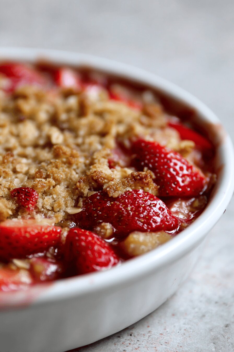 A gluten-free crisp combining strawberries, rhubarb, and apples. Uses tapioca starch instead of cornstarch for thickening. Brown sugar replaces some of the granulated sugar, balanced with coconut sugar for a deeper flavor. Oats and almond flour (substituted gluten-free flour) create the crumble topping, mixed with melted coconut oil for a crispier texture. Baking time adjusted to 50 minutes, checking fruit bubbling and topping golden brown. Remove when juices bubble vigorously and topping firms but remain tender. Cool at least 1 hour to let filling set before serving. No eggs or nuts in base but almond flour adds moistness. Dairy-free possible by swapping butter with coconut oil or vegan spread.