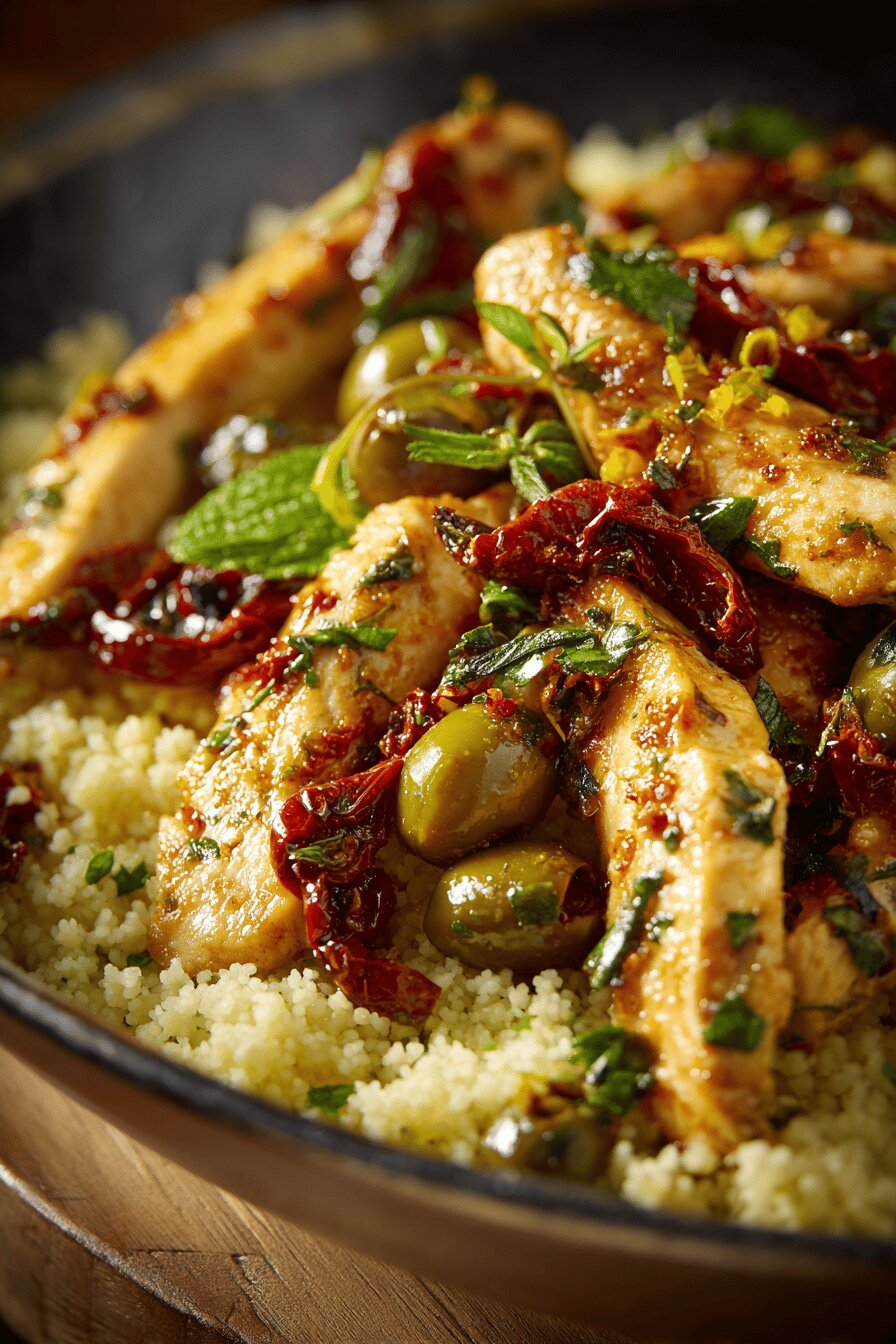 Couscous quick soak, timing slightly longer to get just tender grains, watch moisture. Onions don’t brown too much, just soften, maintaining sweet edges. Chicken strips high heat seared fast for browned crust, juicy interior. Add olives and garlic last for pungent aromatics, keep garlic bite but no burn. Sun-dried tomatoes added late to avoid drying out. Simmer just enough to finish cooking chicken—4 minutes tops at medium heat. Mint tossed on top off heat preserves freshness and green color. Lemon zest sprinkled last moment. Serve immediately for best texture, couscous and chicken not resting long or grain clumps.