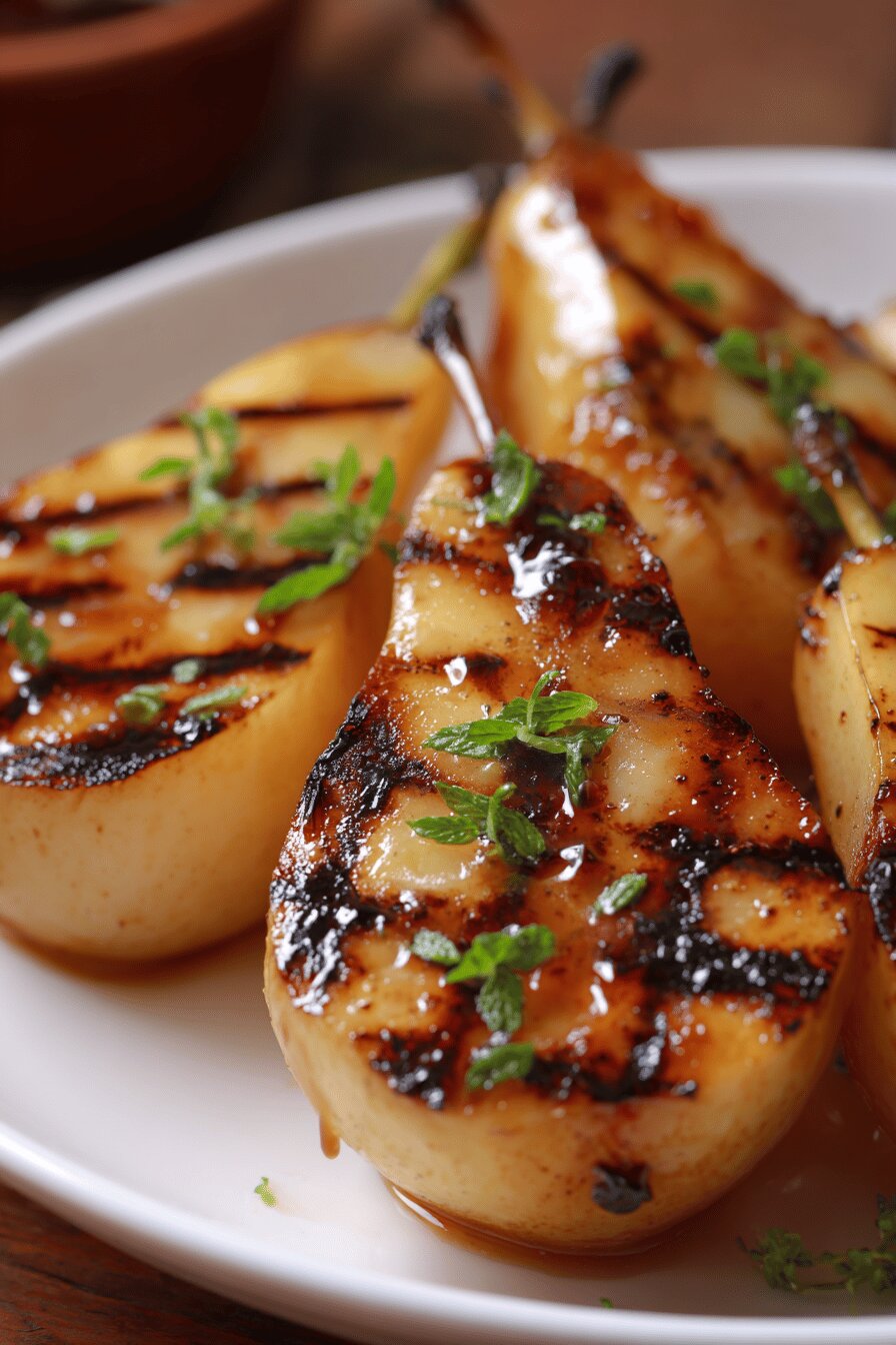 Pears grilled over high heat until tender with a lightly caramelized surface. Citrus juice brightens the fruit, while a sticky maple-lime glaze replaces honey and lemon for added depth. Pears softened but still holding shape, grill marks visible, caramel scents wafting. Simple, fruit-focused dessert without gluten, nuts, dairy, or eggs. Quick, approachable method for summer cookouts or weeknight treats. Tactile doneness cues emphasized over timers.