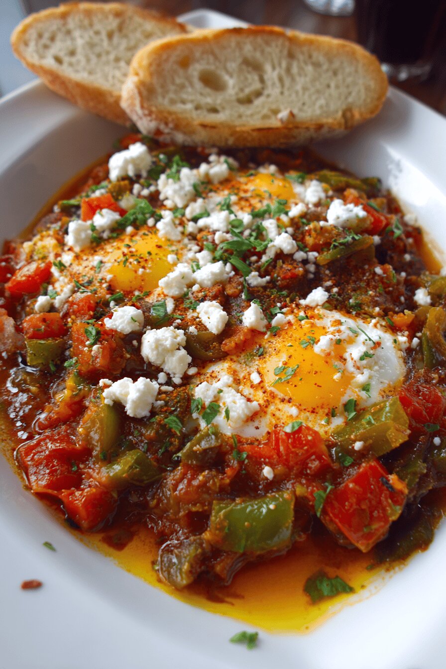 A vibrant Turkish-inspired ragout combining sautéed onions and mild green peppers with fresh tomatoes and smoky Aleppo chili. Eggs are gently poached in the thickened sauce, topped with crumbly feta cheese, and finished with a sprinkle of chili flakes. Clarified butter adds richness and depth, olive oil balances the fat, and gentle simmering pulls flavors together. A rustic, textured dish ideal for breakfast or light lunch served alongside crusty bread or flatbread. Adapted with subtly transformed ingredient quantities and a hint of sweet smoked paprika to add complexity.