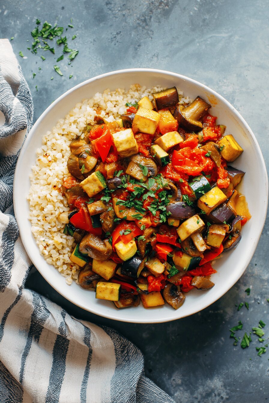 Eggplant and other veggies need patience here—water slogging, slow caramelizing. Don’t rush browning or veggies stew into gray mush. Stepwise sauté for layers of flavor, each veggie gets moment to shine and sizzle. Piercing garlic aroma means just right, no bitterness. Mushrooms chosen shiitake for firmer bite, stand-in for meaty texture. Red peppers swapped for yellow to sweeten subtly. Tomatoes drained to reduce watery stew syndrome. Thyme tied prevents leaves lost in saucy mess. Basil stirred last for vibrant punch. Timing flexible, rely on eye and smell. Done when sauce thickens, veggies tender but intact. Serve with grains, grilled protein, or rustic bread. Simple but demands respect.