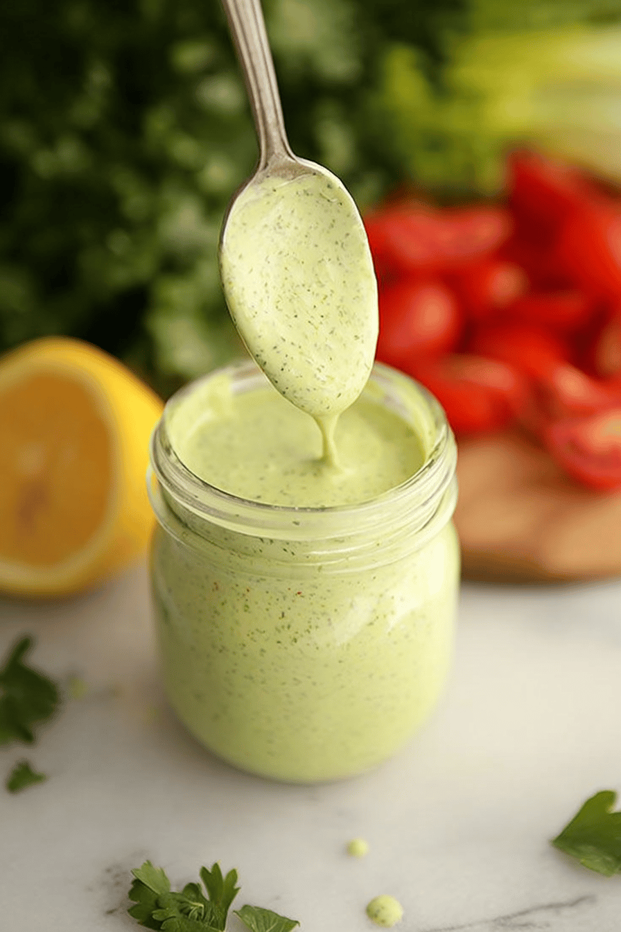 A vibrant green dressing combining creamy avocado and fresh herbs, thick yet pourable, bursting with bright herbal notes. Uses substituted mayo for richer texture and lemon juice for a sharper acidity. Parsley replaces chives, adding earthiness, while cilantro adds vibrant color and complexity. Garlic and anchovy paste bring umami depth; Dijon mustard introduces slight heat and emulsification. Chill to let flavors marry. Pungent aroma hints at its boldness. Smooth, luscious texture contrasts crisp greens. Adjust salt carefully; over-salting kills herbs’ brightness. Store cold, use within a week, ideal for salads, grilled veggies, or as dip.