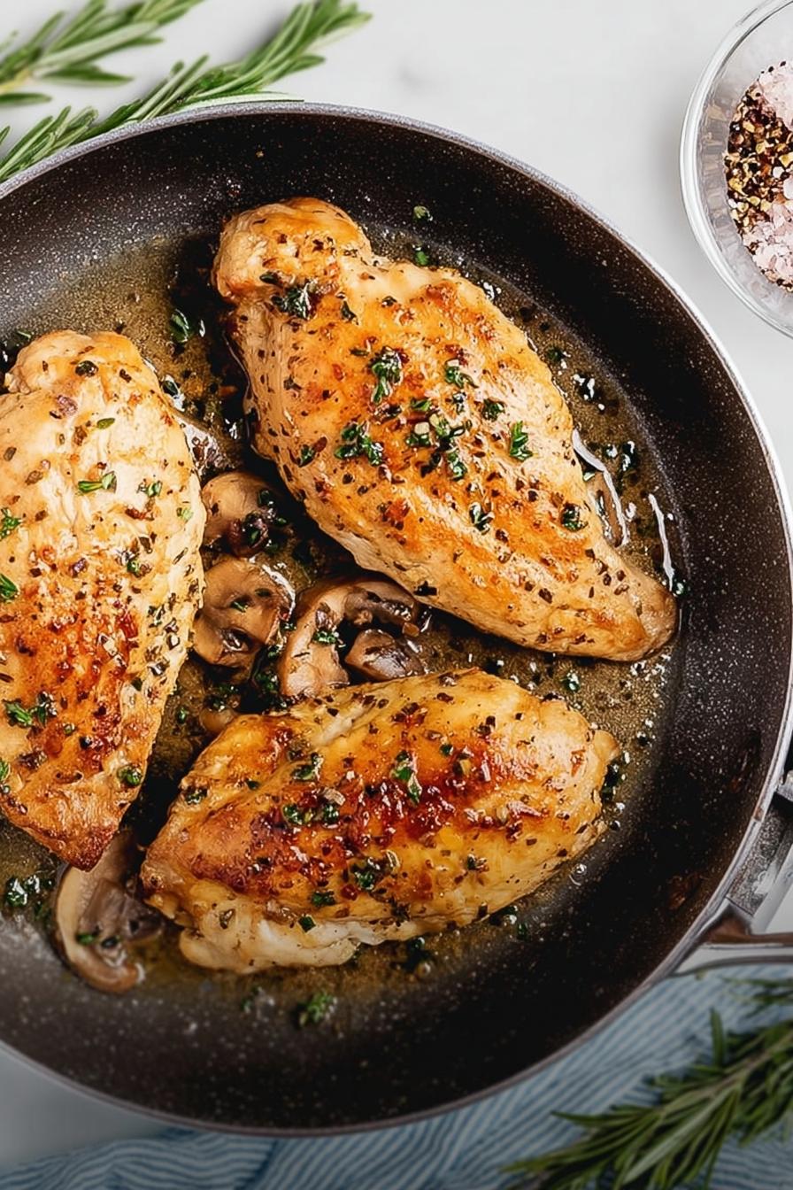 Pat chicken dry—non-negotiable step. Spices stick better, crust forms quicker. Heat skillet medium to medium-high (depends on stove), test by flicking a drop of water in pan; it should dance and evaporate immediately. Add oil, let it heat until shimmering before adding chicken for a proper sear. Resist moving chicken around once in pan or you tear crust; the first side needs to develop a golden brown crust, listen for steady sizzle but no burning. Use instant-read thermometer if unsure; 165°F ensures fully cooked safe chicken. Too high heat cooks outside too fast, inside remains raw; too low heat shrinks moisture out. After cooking, rest chicken at least 5 minutes loosely tented to allow juices to redistribute preventing dryness. Reduce heat before adding garlic and herbs; high heat burns garlic bitter and toughens herbs. When simmering broth, scrape bottom of pan for fond; that’s flavor gold. Butter stirred last off heat thickens sauce into smooth glossy coating. Spoon sauce to coat chicken well before slicing. Slice against grain for tenderness, a critical detail frequently overlooked. Garnish last minute to maintain fresh herb crispness.