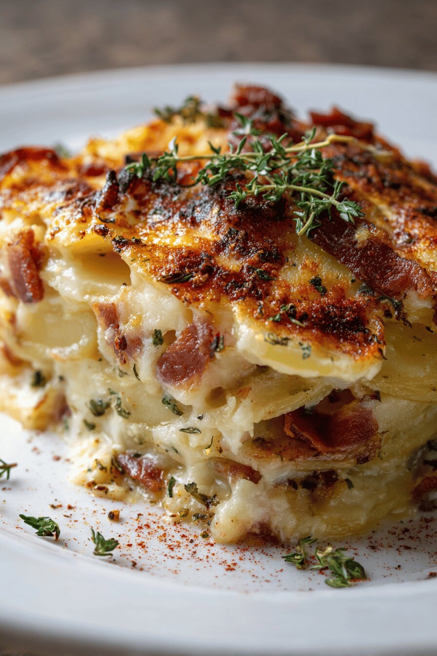 Layers of thin potato slices mingled with crispy bacon and fresh herbs. Creamy, cheesy, baked until golden. Substituting rosemary with thyme. Replaced cream with coconut milk to add subtle sweetness. Added a sprinkle of smoked paprika for depth. Cook times adjusted slightly. Prep includes chilling bacon before slicing for crispier bites. The potato type changed to Yukon gold for better texture. Dish serves 8 to 10 comfortably. Low allergy risk, gluten and egg free. Rich, herbaceous, smoky. Ideal for gatherings or weeknight dinners.