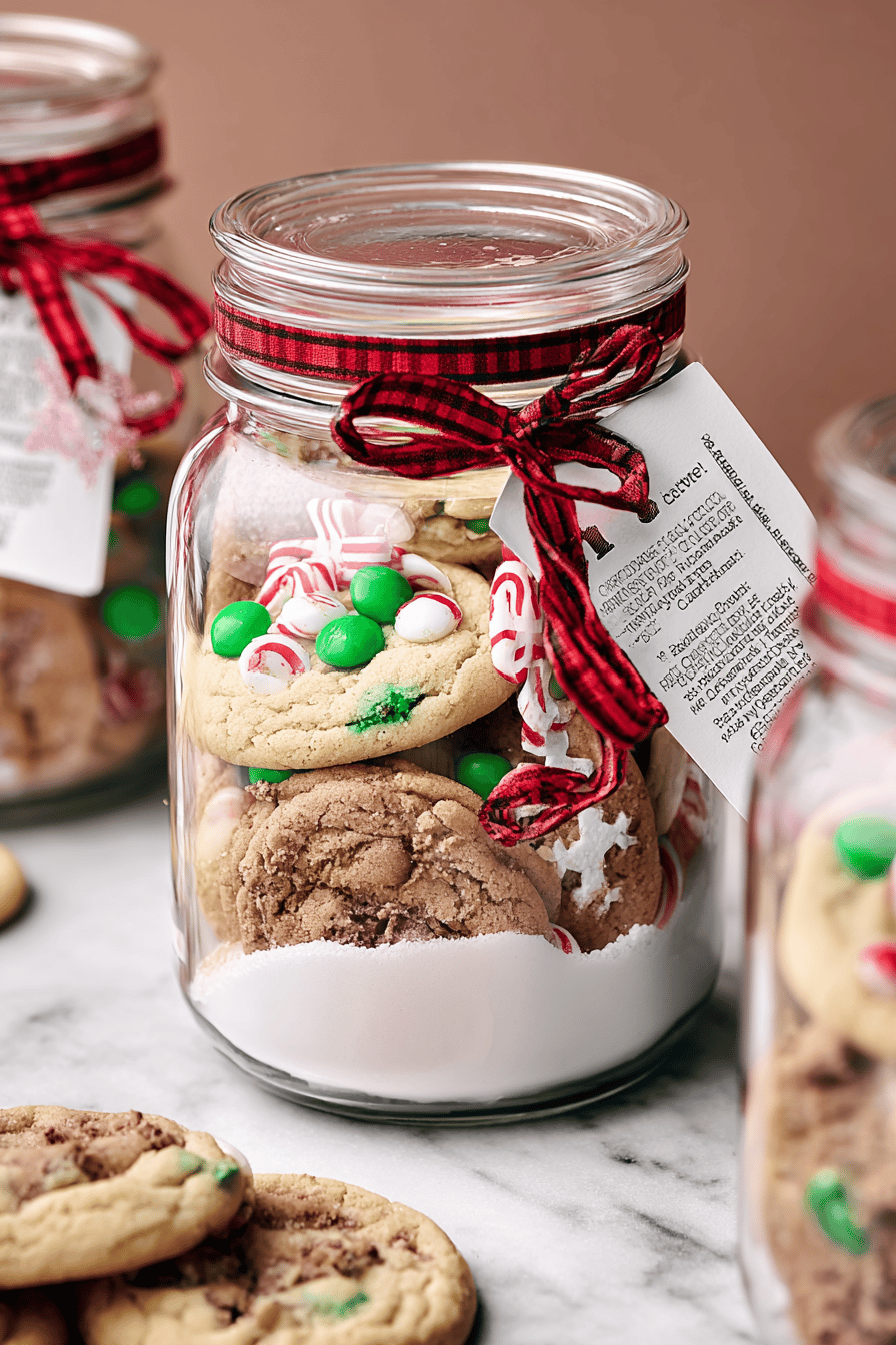 Get your hands in on old school layering technique. No fancy gadgets. Few ingredients, straightforward methods. Flour blended with cornstarch stabilizes crumb — gives you that tender, not cakey texture. Brown sugar’s moisture, white sugar’s snap. Layer sugars separately to avoid clumping early on. Chocolate chunks hold up better under heat than chips — less melty mess. Candy-coated chocolates add color and crunch without bleeding dye if added last. Assembly kind of meditative: precise layers, gentle tapping to level. Seal jar tight, decorate if you want to gift it. When ready, simple steps for mixing wet then dry without overworking dough. Watch cookies carefully — centers stay soft while edges turn golden, smell shifts from sweet raw dough to warm chocolate comfort. Swirling the cookies right out of oven rounds off rough edges — a chef’s trick for show-stopping look. Cool completely or freeze for later. Pantry-friendly, versatile, day-to-night snack-ready. Perfect for gifting or a last-minute dessert win. Master this, and your holiday baking just got easier.