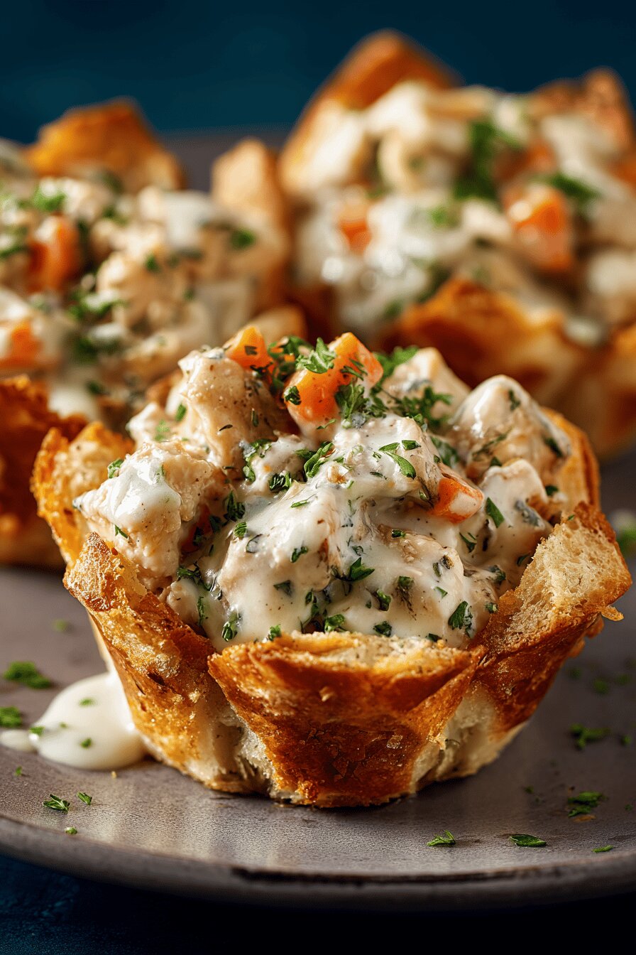 Bread shells instead of puff pastry. Why wait for dough to rise or thaw? Quick butter layer crisps bread into shape, sturdy enough for creamy filling. Chicken diced sharpens texture, carrots sneak in moisture and slight sweetness. Cream sauce replaces classic béchamel milk for smooth mouthfeel. Timing key—bread going golden hints readiness; listen for hollow sound when tapped. Filling thickened just right, coats spoon, clings but not gluey. Natural seasoning calls for white pepper, barely a pinch of nutmeg — subtle but builds layers. Assemble just before serving; soggy sight ruins crisp contrast. Test edges before unmolding, handle gentle with still-warm shells. No fluff, straight to method that saves time and mess. Get grounded in real kitchens where efficiency meets flavor.