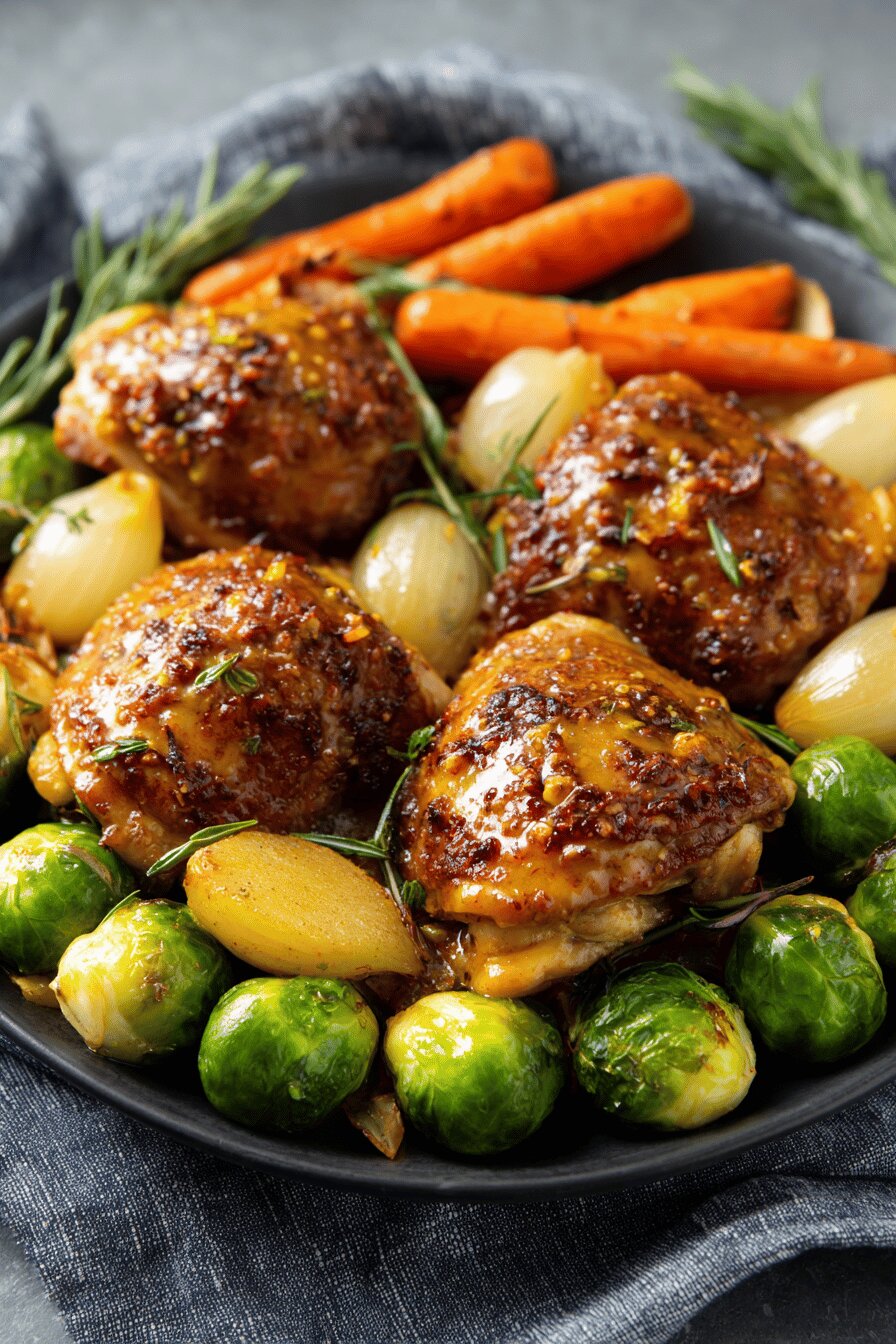 Six skin-on chicken thighs baked with a bold honey mustard glaze balanced by aromatic spices and a touch of chili. Roasted Brussels sprouts, shallots, and baby carrots finish alongside, caramelizing until tender with a hint of char. Ingredients slightly altered to swap ketchup with tomato paste and mustard Dijon swapped to whole grain mustard for texture contrast. Sauce simmering builds deep flavor. Visual doneness cues emphasized over strict timing. Practical tips included for seasoning, pan choices, and rotation of veggies to avoid sogginess. Sweet, savory, and spicy layers in one pan gourmet experience, simple to execute, hard to mess up.