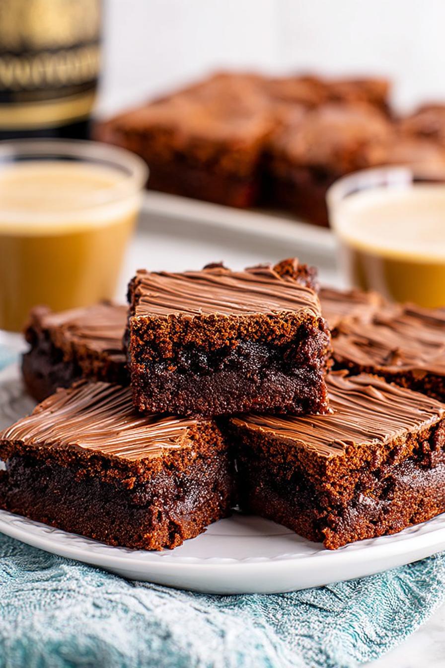 Dense brownies infused with Irish whiskey and coffee liqueur for depth. Topped with a whipped whiskey ganache replacing some cream with mascarpone for a tangy twist. Melted bittersweet chocolate drizzle optional. Watch for telltale glossy top, toothpick clean from near edge, and whipped peaks for textural checks. Flexible substitutions include bourbon or spiced rum, and vegetable oil swap with melted butter. Techniques focus on batter incorporation and ganache tempering, ensuring richness without greasiness or graininess. Baking time altered slightly to catch that chewy edge with moist center. Parchment paper lift is crucial for neat slicing.